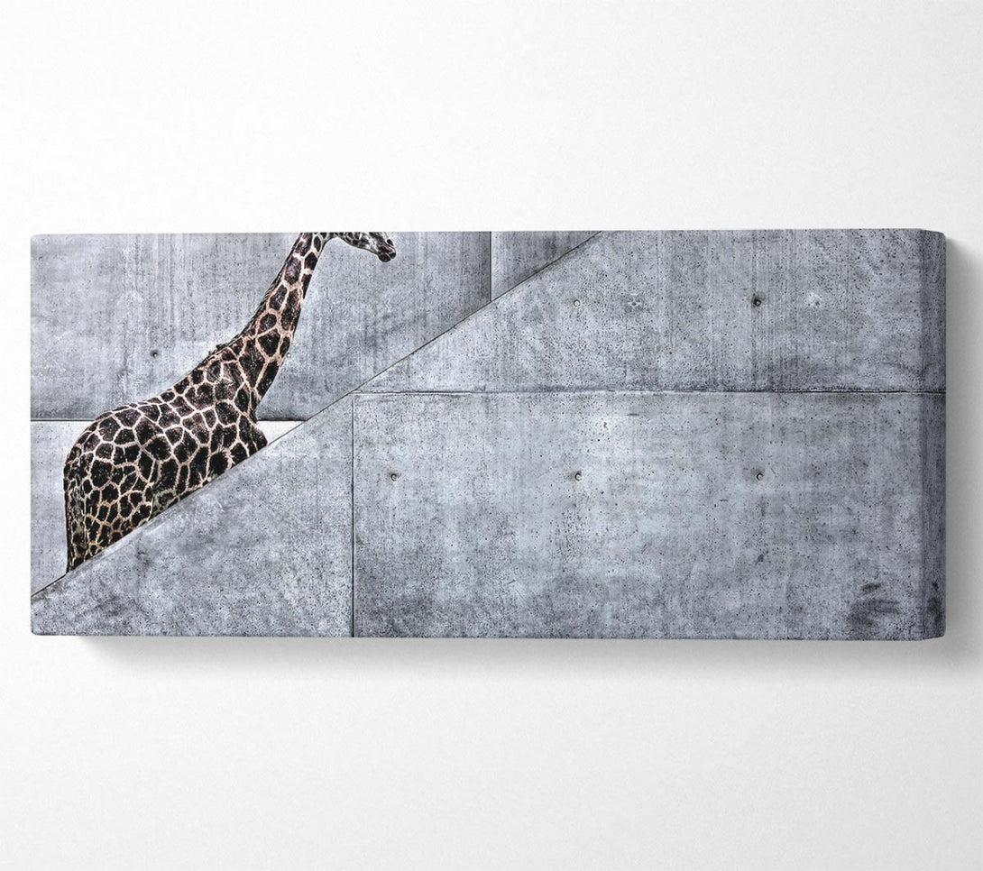 Giraffe Climbing Stairs canvas, printed on coated polyester canvas. Mounted on to a 44mm box frame, ready to hang.