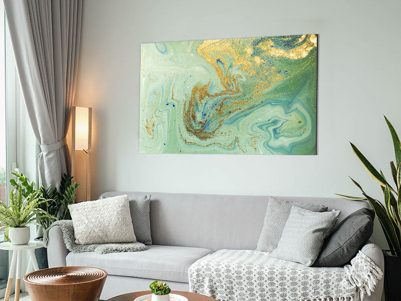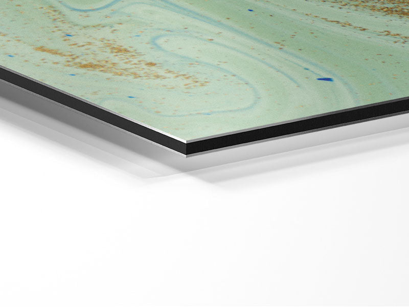 Glitter And Oil Splash Printed on brushed aluminium dibond. A modern way to display art and easy to maintain.