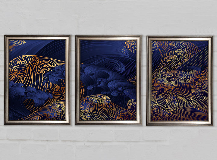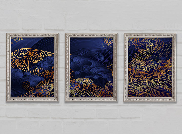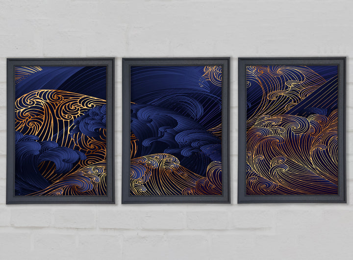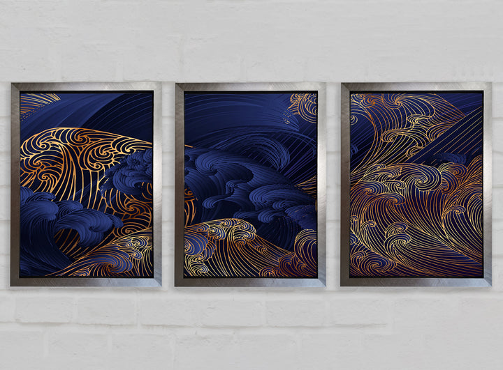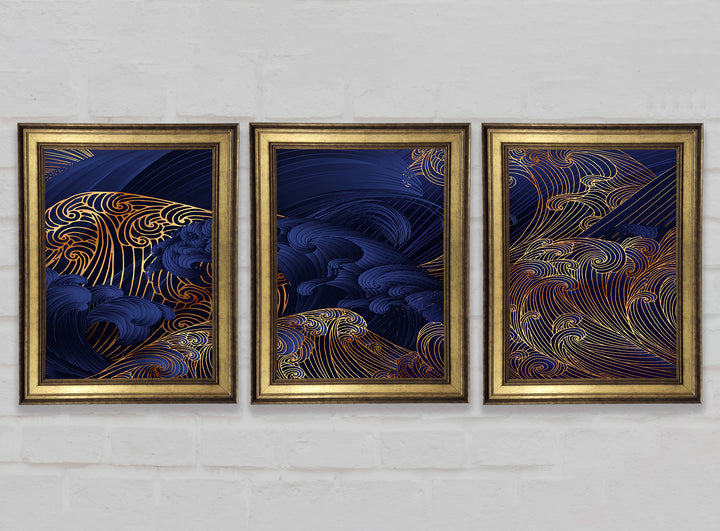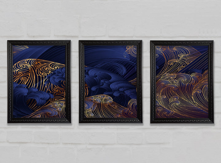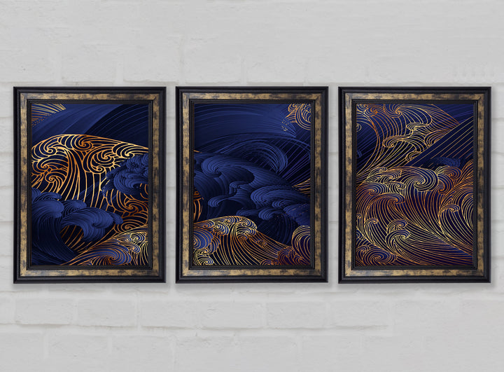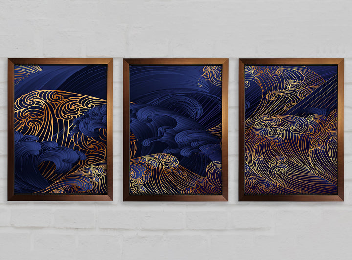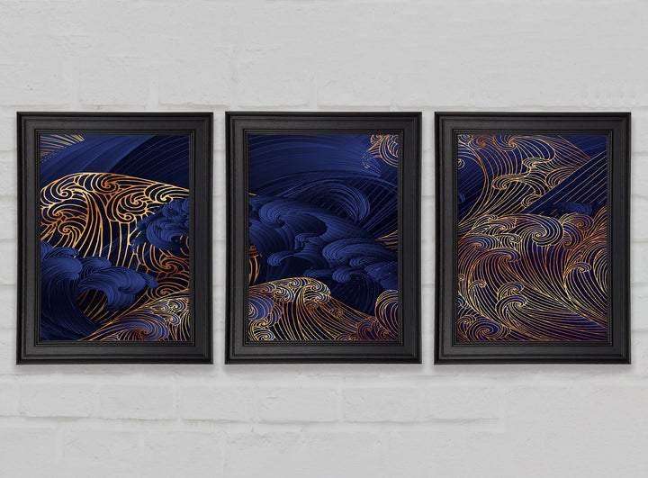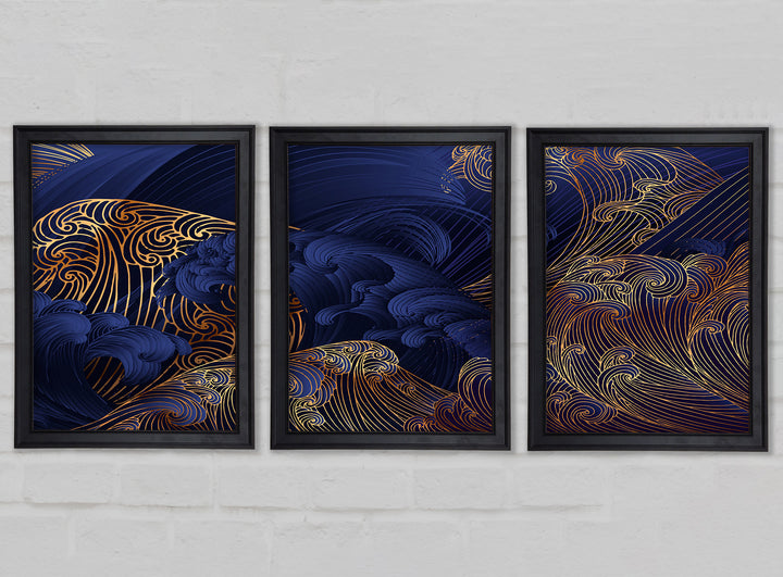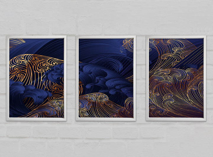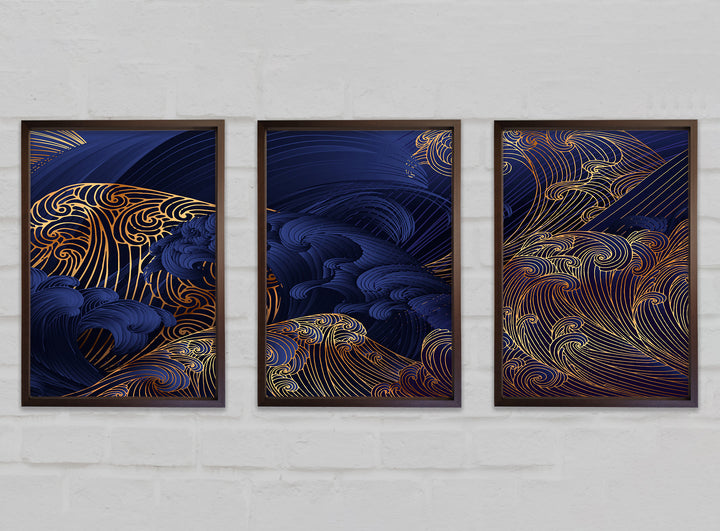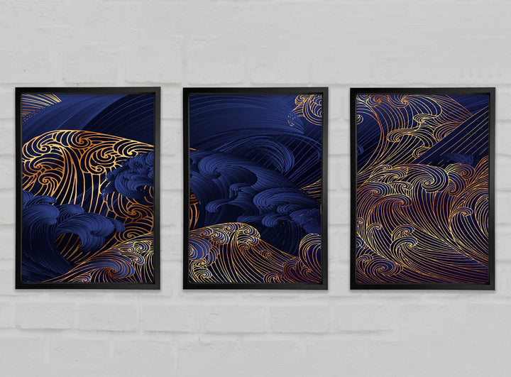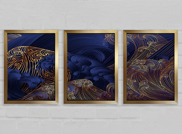 Gold and Blue Waves Japanese Art set of 3 framed print wall art, available in mutiple frame colours. Ready to hang from the box and handmade in the United Kingdom.