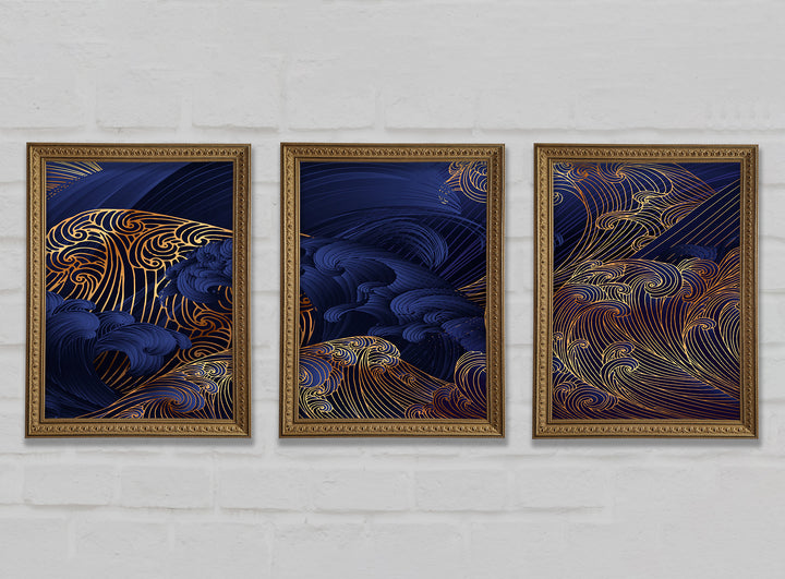 Gold and Blue Waves Japanese Art 3 Piece Prints