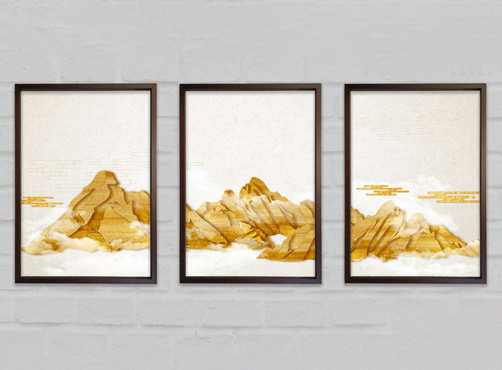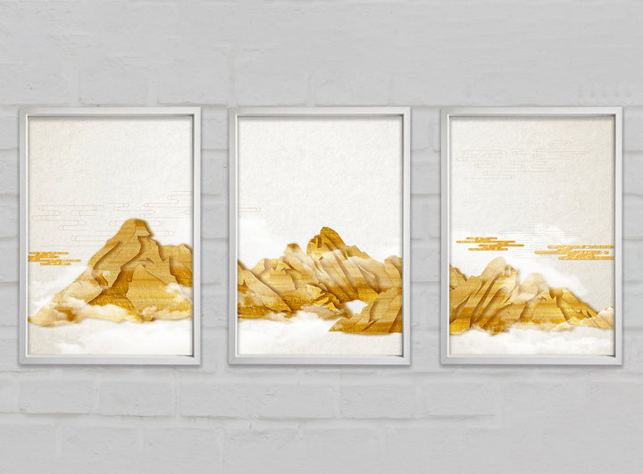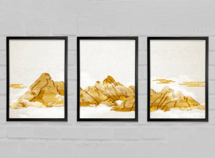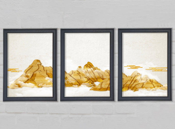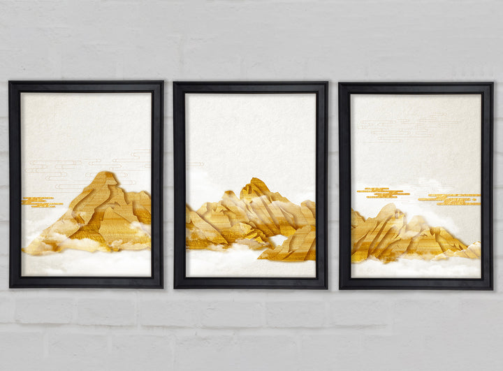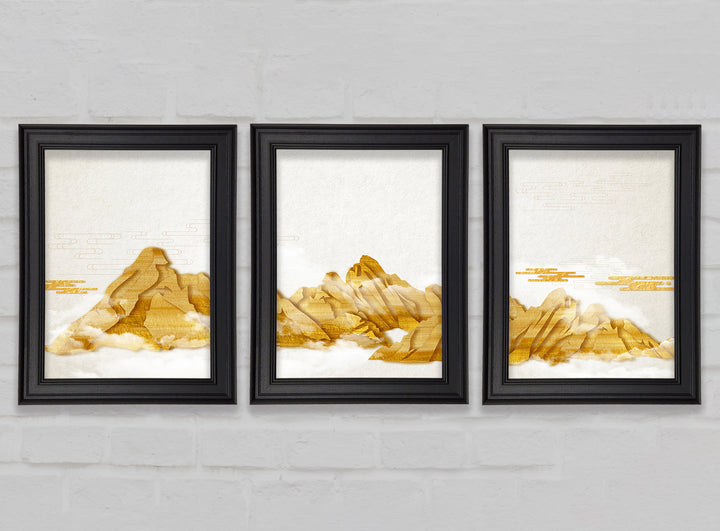 Gold Mountain Range set of 3 framed print wall art, available in mutiple frame colours. Ready to hang from the box and handmade in the United Kingdom.