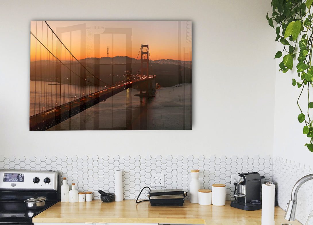 Golden Gate Bridge Sunset Glow acrylic print, UV printed onto 5mm thick acrylic glass. Comes with everything you need to hang on your wall.