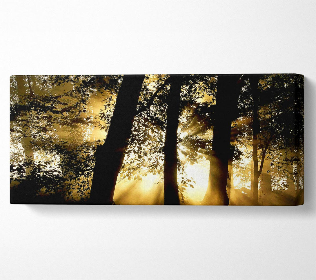 Golden Sun Beam Forest canvas, printed on coated polyester canvas. Mounted on to a 44mm box frame, ready to hang.