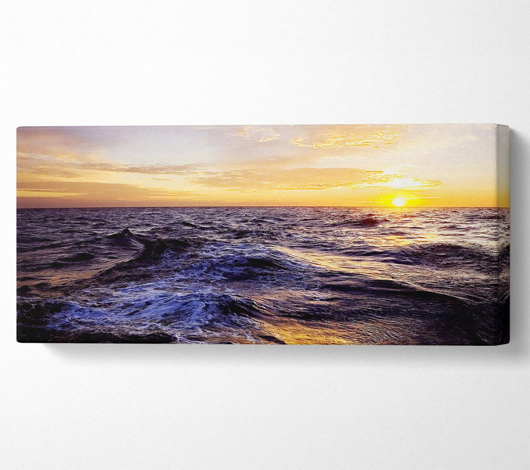 Golden Waves Crashing canvas, printed on coated polyester canvas. Mounted on to a 44mm box frame, ready to hang.