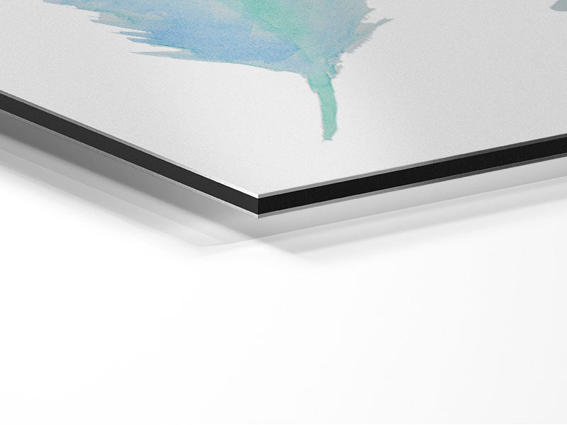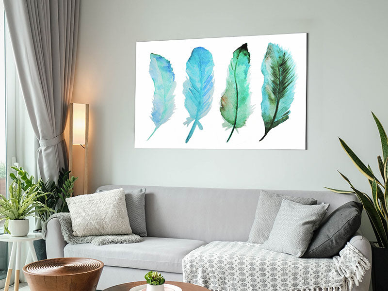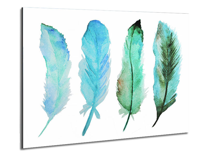 Green Blue Indian Feathers Printed on brushed aluminium dibond. A modern way to display art and easy to maintain.