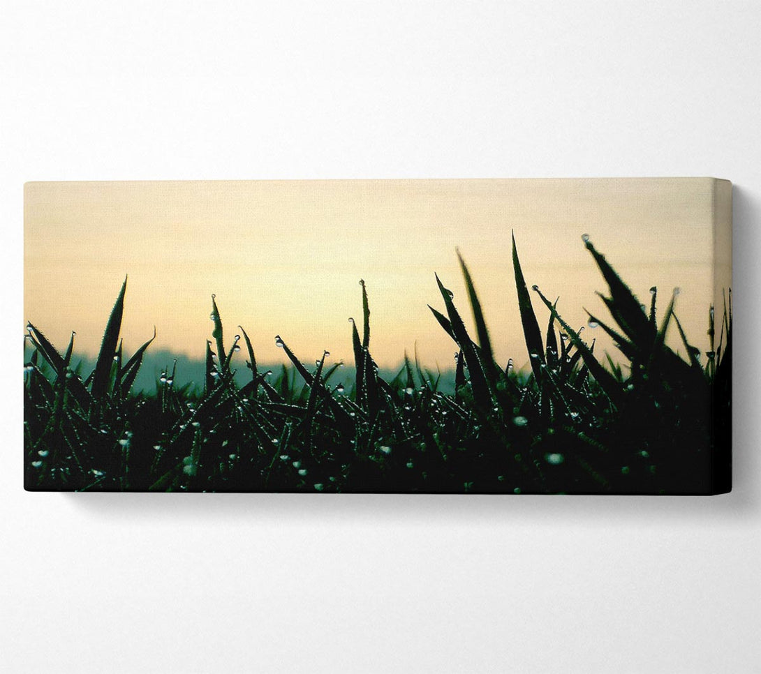 Green Dew Grass In The Morning Light canvas, printed on coated polyester canvas. Mounted on to a 44mm box frame, ready to hang.