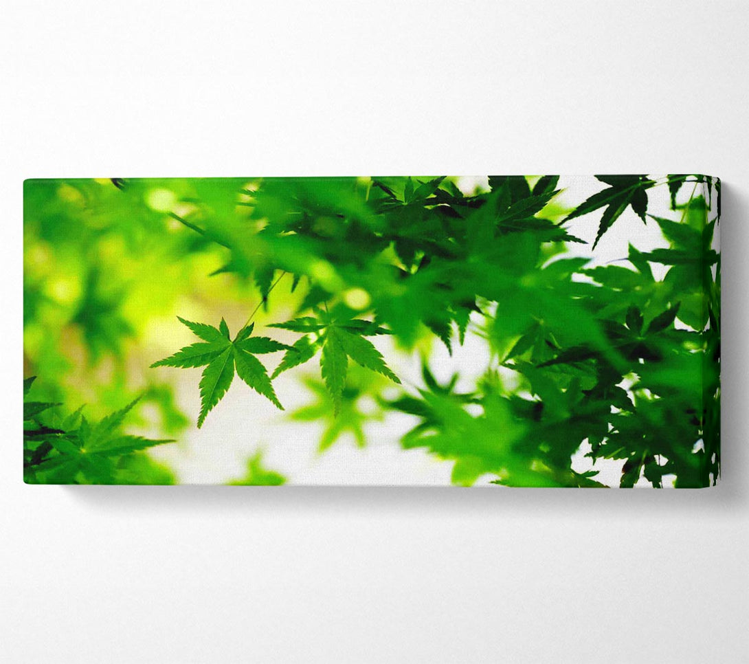 Green Leaves Bathed In Sunlight canvas, printed on coated polyester canvas. Mounted on to a 44mm box frame, ready to hang.