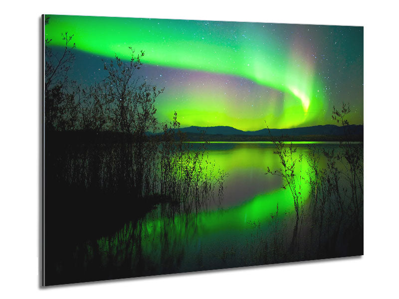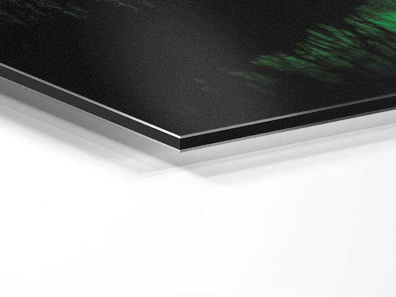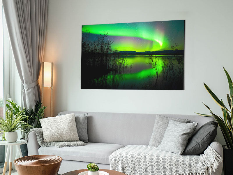 Green Northern Lights Printed on brushed aluminium dibond. A modern way to display art and easy to maintain.