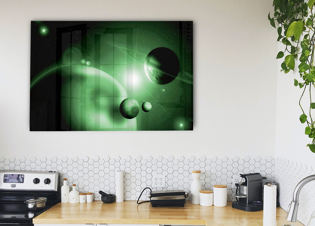 Green Planets acrylic print, UV printed onto 5mm thick acrylic glass. Comes with everything you need to hang on your wall.