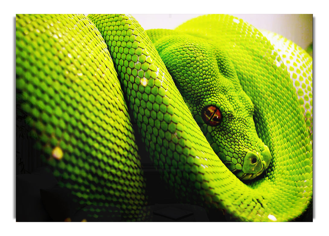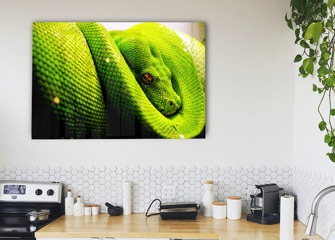 Green Snake Huddle acrylic print, UV printed onto 5mm thick acrylic glass. Comes with everything you need to hang on your wall.