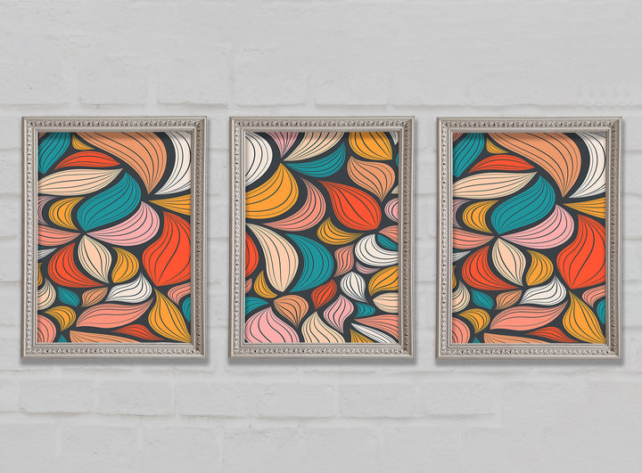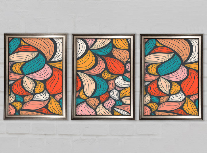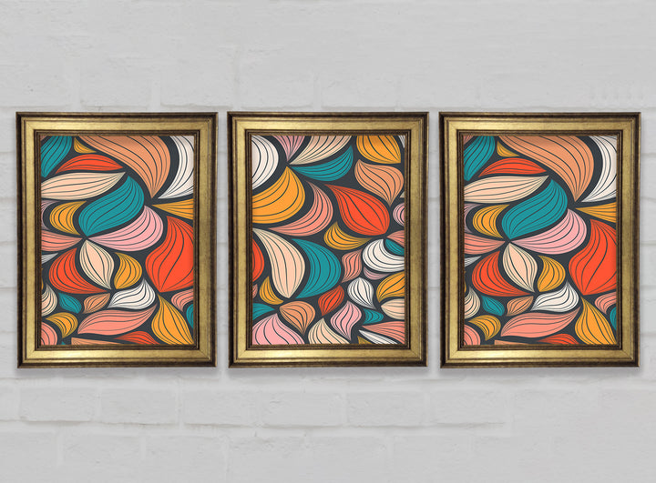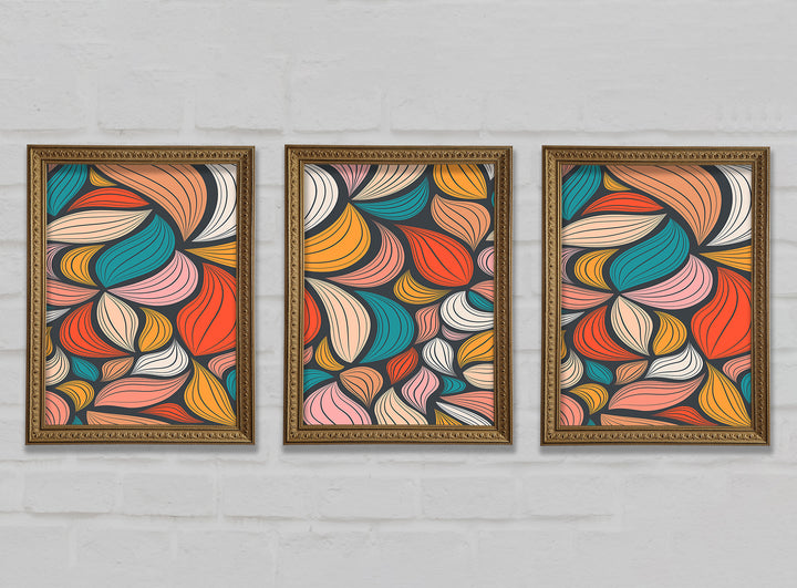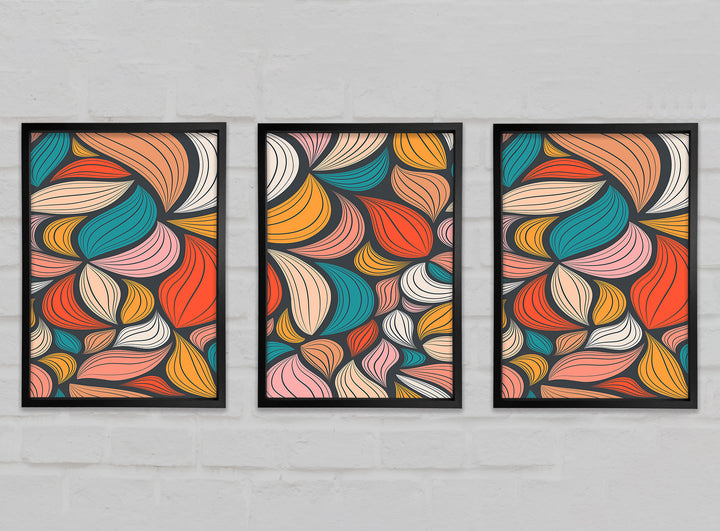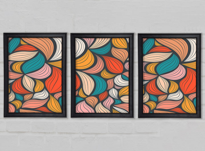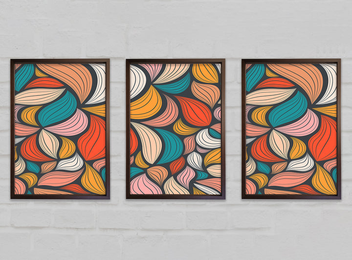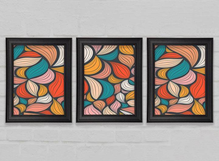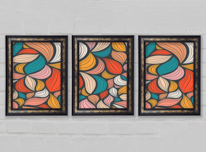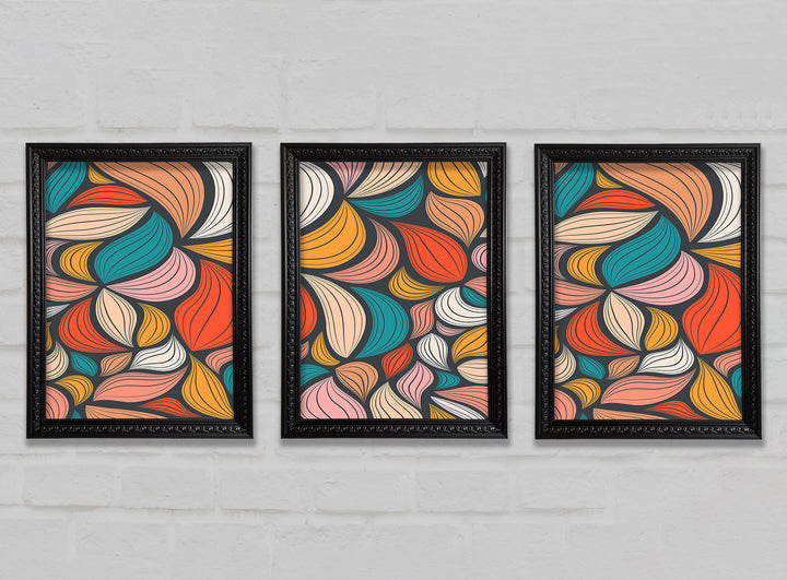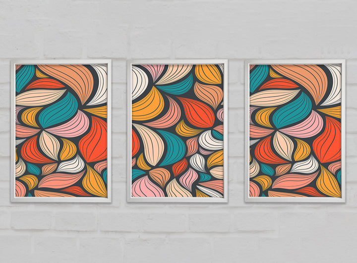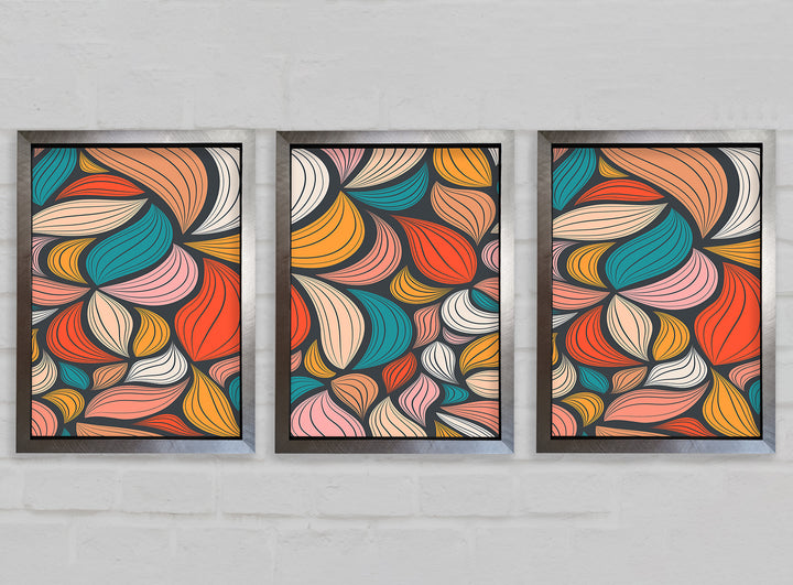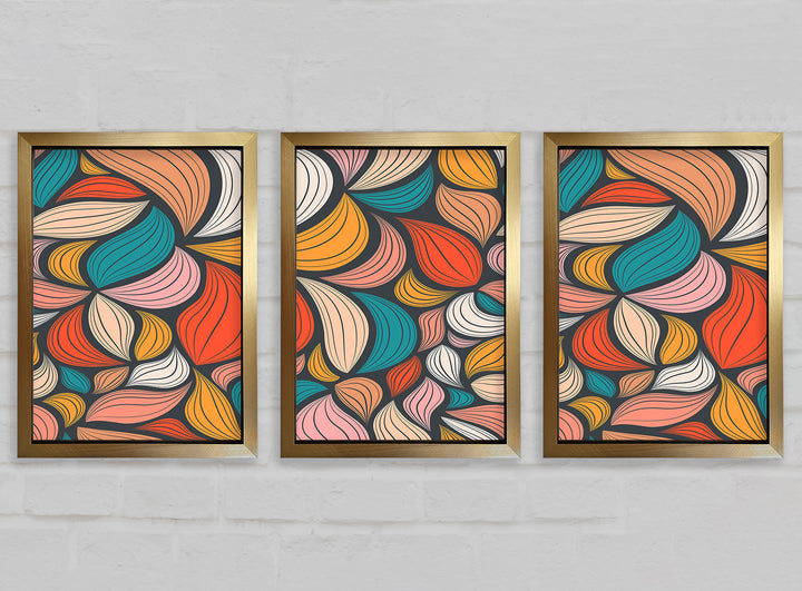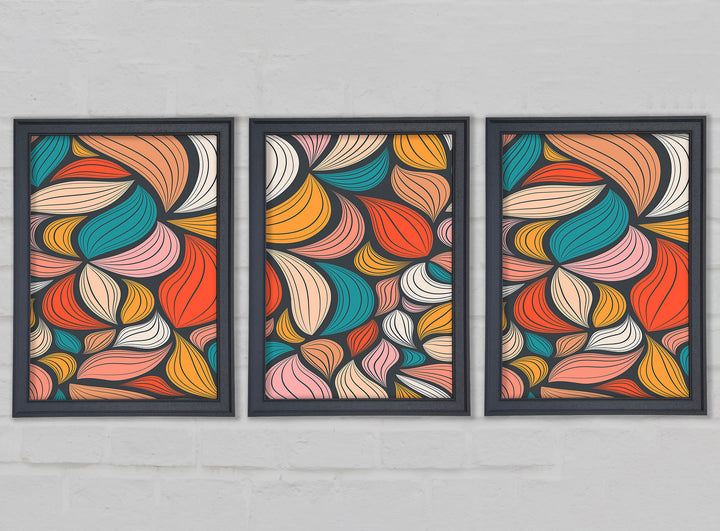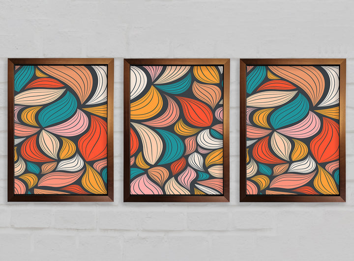 Groovy Autumn Petals set of 3 framed print wall art, available in mutiple frame colours. Ready to hang from the box and handmade in the United Kingdom.