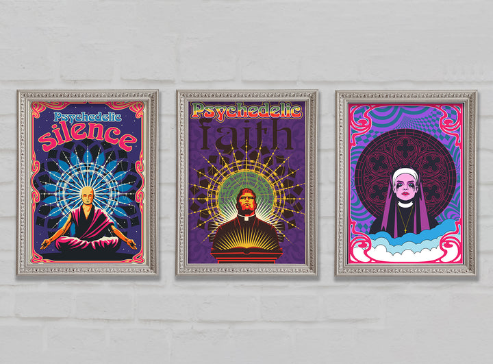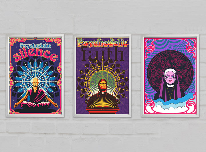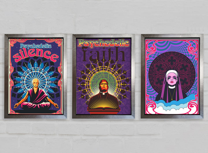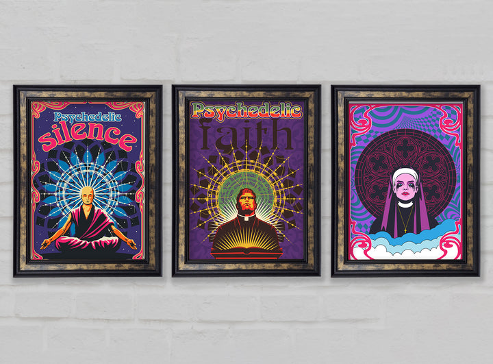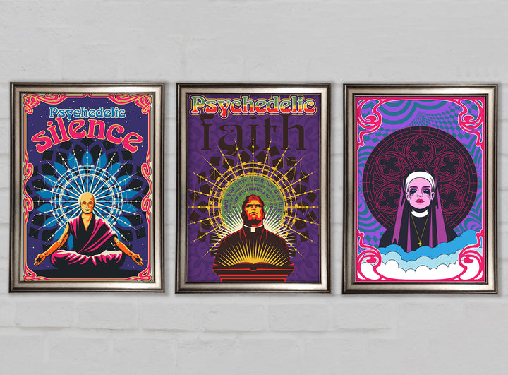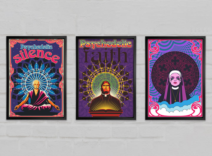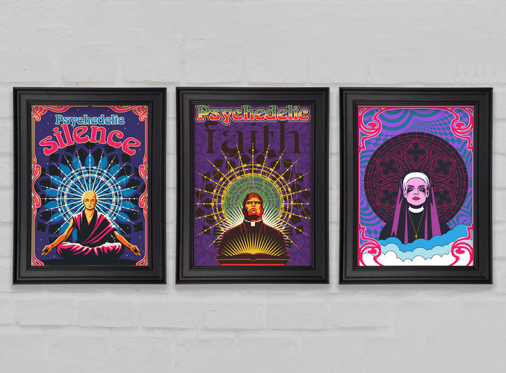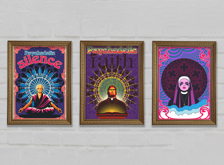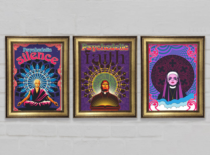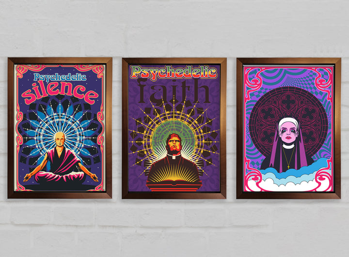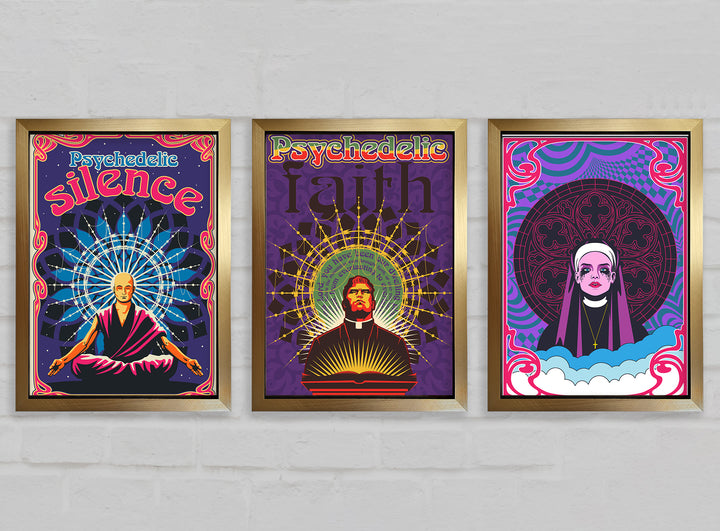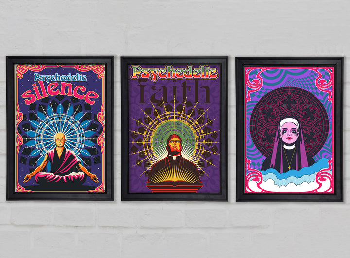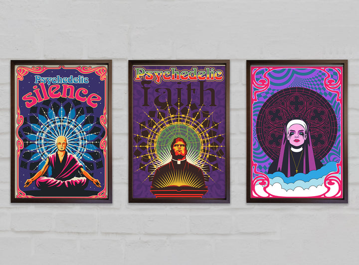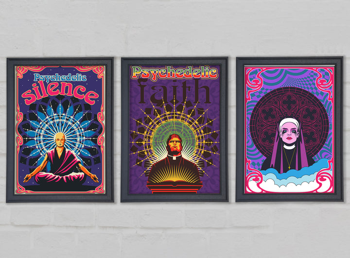 Groovy Seventies set of 3 framed print wall art, available in mutiple frame colours. Ready to hang from the box and handmade in the United Kingdom.