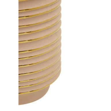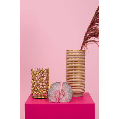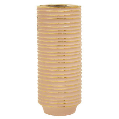 Ideal for long-stem flowers and decor, this ceramic vase boasts hand-painted detail of stripes in the warm metallic finish on its glazed white surface.