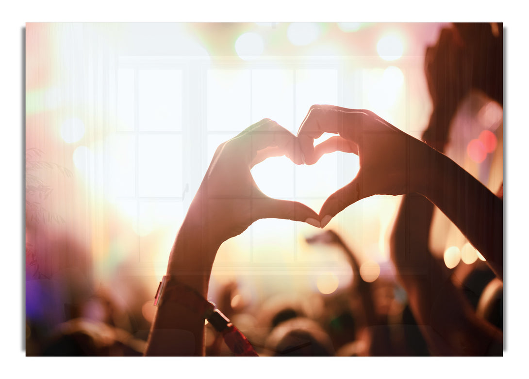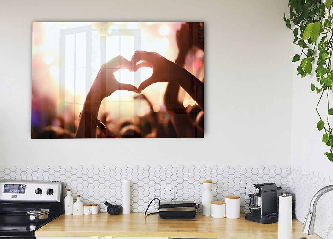Heart hands in the air acrylic print, UV printed onto 5mm thick acrylic glass. Comes with everything you need to hang on your wall.