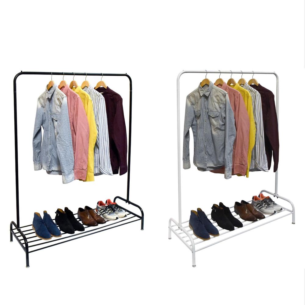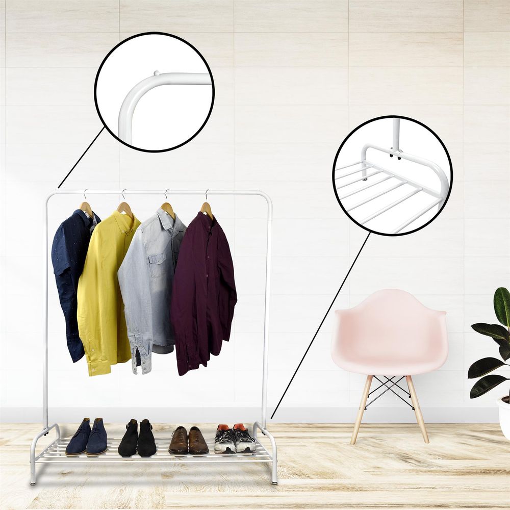 MULTIFUNCTIONAL ENTRYWAY ORGANIZER: Unsophisticated combination of clothes rail and shoe rack, perfect for organising your everyday outfits or for displaying your seasonal favourites. This clothes rail comes with side stoppers to prevent the clothes from falling, and a bottom shelf is made of 7 bars where shoes, boots or other accessories can be kept.