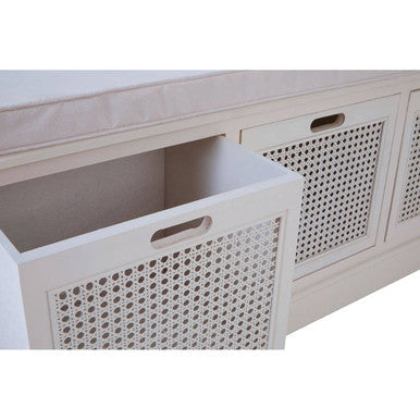This storage bench is constructed from natural wood and has an antique white finish. It has three pull out storage drawers with cutout handles, while their cane wood facing is perforated. The drawers are coloured to coordinate with the soft white shade of the bench. A rectangular padded seat is matched with the overall colour scheme to complete the look.