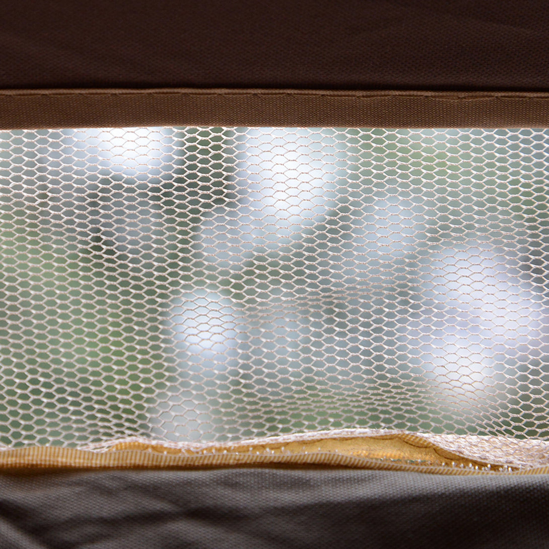 - Six mesh curtains to provide privacy and protection against bugs when down. Can be tied to the frame when not needed, with a middle zip fastening for easy access when in use