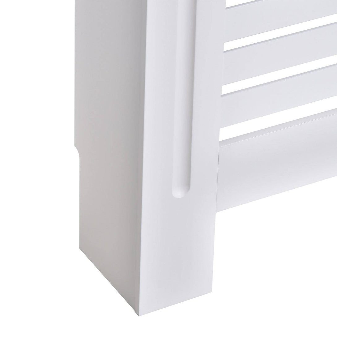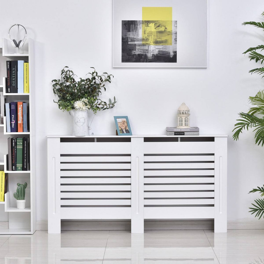 This modern radiator cover from HOMCOM is a designed to help hide old or unsightly radiator, protect hands from hot surface and offer extra shelving for ornaments. The slatted design with sufficient vents allows for fluid heat flow while still preventing children and pets from touching the hot radiator surface. Manufactured from durable MDF in white finish for long term service, it is an elegant yet practical addition to your home and office.