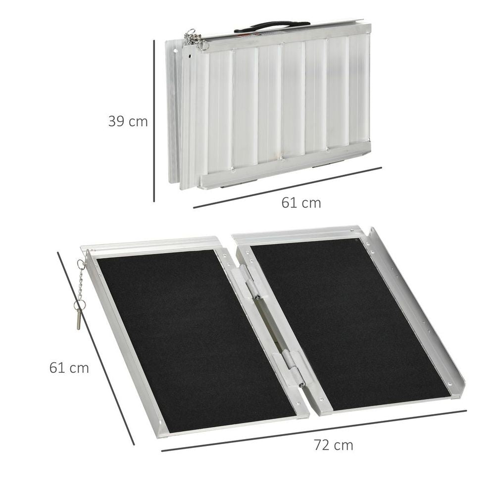 DOUBLE DESIGN: No need to use with another step ramp, simply unfold, put in place, and it's ready to use!ANTI-SLIP SURFACE: The aluminium ramp prevents wheels from rolling and slipping, with a high-rise rail on both sides for extra safety and precaution. PVC on the top to prevent wheels from moving when up.MADE FROM ALUMINIUM ALLOY: Anti-corrosive, strong and durable, the portable ramp provides extensive use both indoors and outdoors. FOLDABLE: With handle and lock and chain, it allows you to carry it easily from place to place.DOOR RAMP DIMENSIONS: 72W x 61Lcm. Folded: 61L x 39W x 9Tcm. The applicable height of this 61cm, ramp is 5-15cm, and the recommended height is 5-10cm. MAXIMUM LOAD WEIGHT 270kg.EASY TO SET UP AND USE. SUITABLE FOR WHEELCHAIRS, PUSHCHAIRS, ROLLATORS ETC. You can follow the steps to buy this aluminium ramp. Step 1. Measure the rise of your application. Step 2. Pick the proper ramp length based on your height of use.