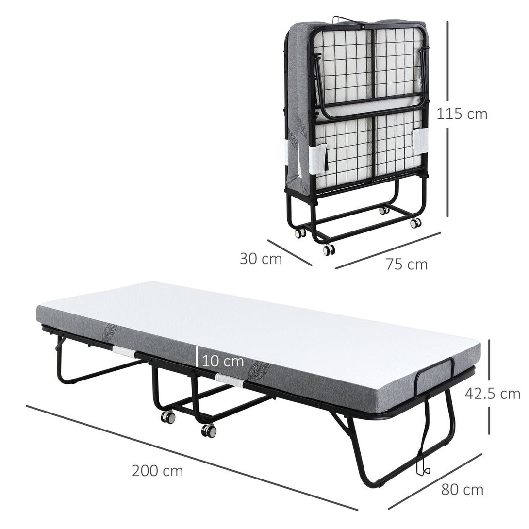 Last minute overnight guests? No problem. This HOMCOM wheeled single bed is so easy to move and gives you a restful sleep, wherever it stays. The metal frame is strong, with the four long legs giving balance. It comes with a top mattress - 10cm thick and soft, it will keep you comfortable with just the right amount of support. Four wheels on the base mean you can move it around easily from room to room - two lock into place so no moving once ready. And when done, simply fold in half to store.