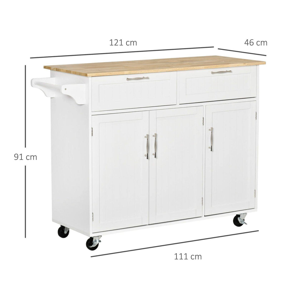 Looking to maximise your kitchen space? Do it with this kitchen island from HOMCOM. A simple, modern design in clean white is great for matching with plenty of different home interiors. Comes with two easy-glide drawers, three cabinets and a towel hanging rail - plenty of room for all your tableware, glassware, pots, pans cutlery and food. Four wheels make it mobile, you can take this anywhere you want. It's finished with a wood countertop - a solid place to prepare food.