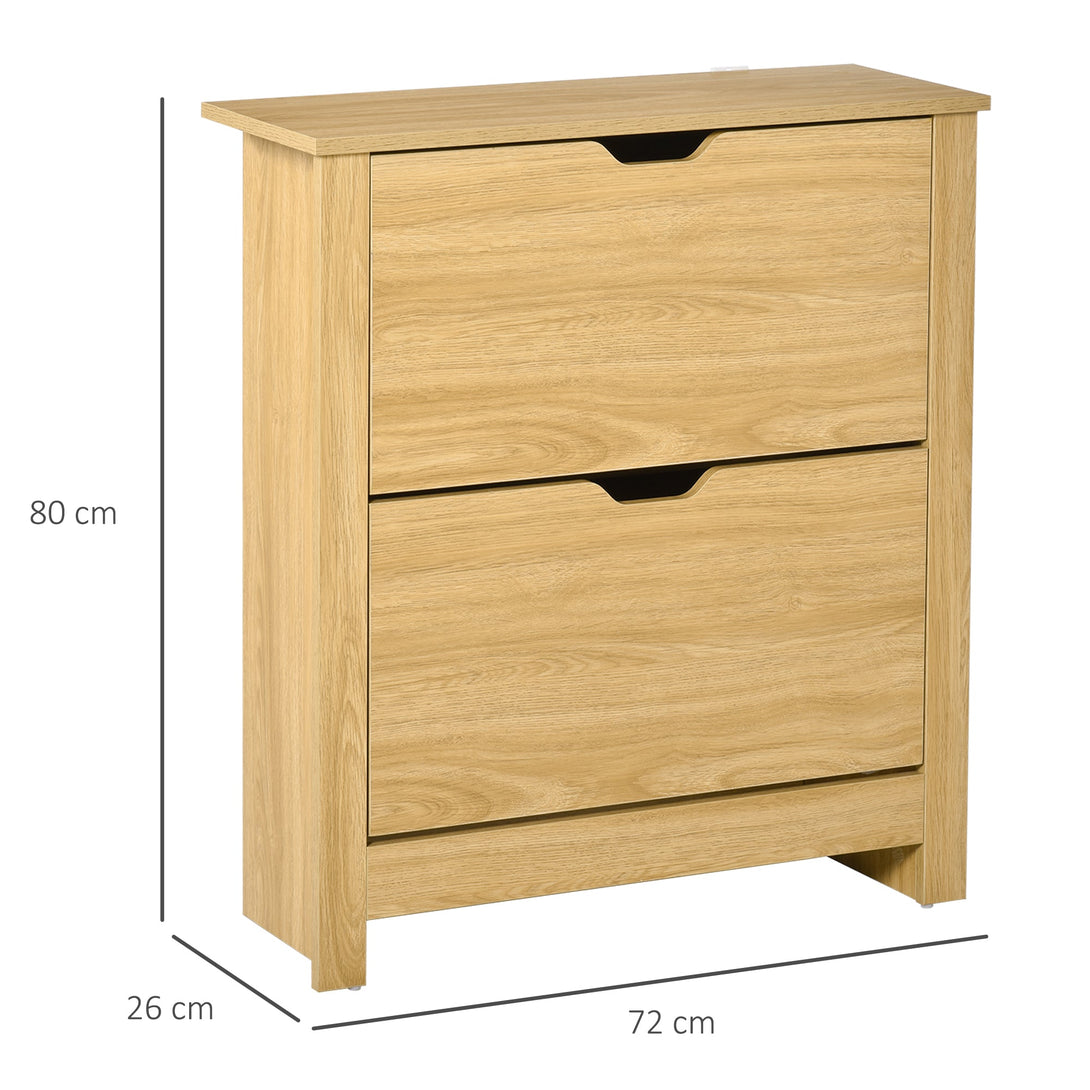 This compact shoe cabinet from HOMCOM will help to keep your home effortlessly decluttered. A particle board construction ensures a tough and solid frame, with a smooth coating so it can be cleaned easily. Two pull-down drawers hold two shelves each, which stores up to 12 pairs of shoes for easy organisation. A groove handle allows you to open and close. An oak-tone top allows extra holding and display space, with feet to keep the unit balanced.