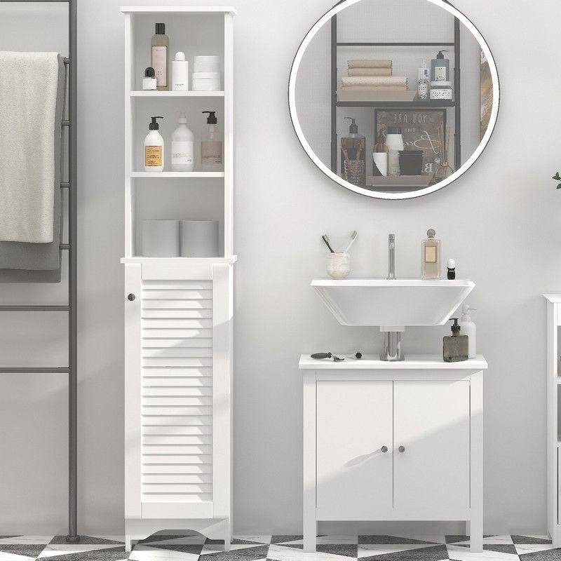 Bring some retro elegance into your bathroom with this cabinet from HOMCOM. A tall and slimline 165cm x 34cm design, it is ideal for fitting into small spots, featuring three open shelves and a cupboard with three shelves for giving you plenty of storage space. The shelves are adjustable to suit your storage requirements. Made from particle board, this unit is durable and reliable for everyday use, with the shutter design on the cupboard door allowing air flow when closed. It's finished with a sturdy base to keep it balanced.
