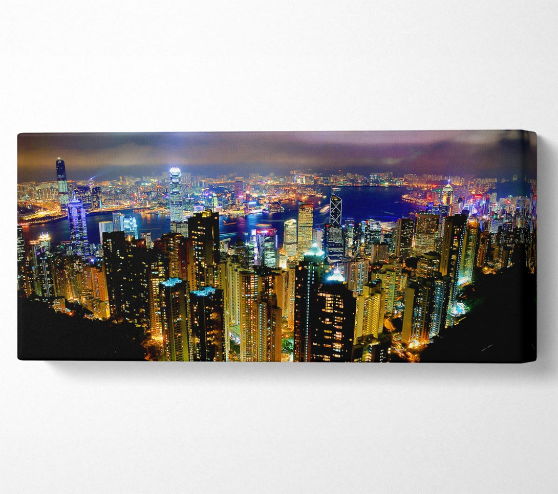 Hong Kong Night Light canvas, printed on coated polyester canvas. Mounted on to a 44mm box frame, ready to hang.