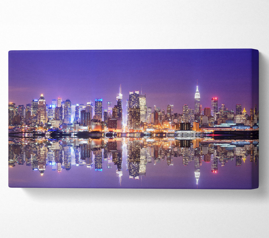Hong kong purples and blues reflection wide canvas, printed on coated polyester canvas. Mounted on to a 44mm box frame, ready to hang.