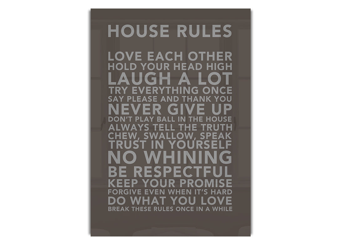 House Rules 3 Chocolate acrylic print, UV printed onto 5mm thick acrylic glass. Comes with everything you need to hang on your wall.