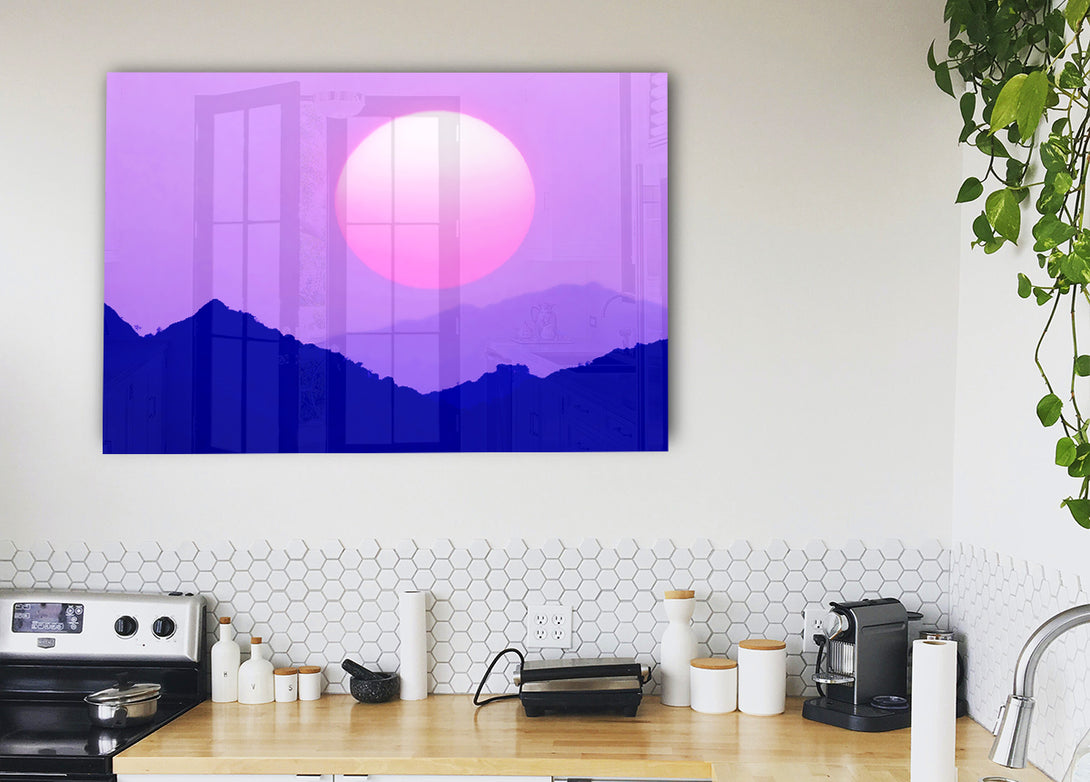 Huge Sun Over The Mountain Tops Purple acrylic print, UV printed onto 5mm thick acrylic glass. Comes with everything you need to hang on your wall.