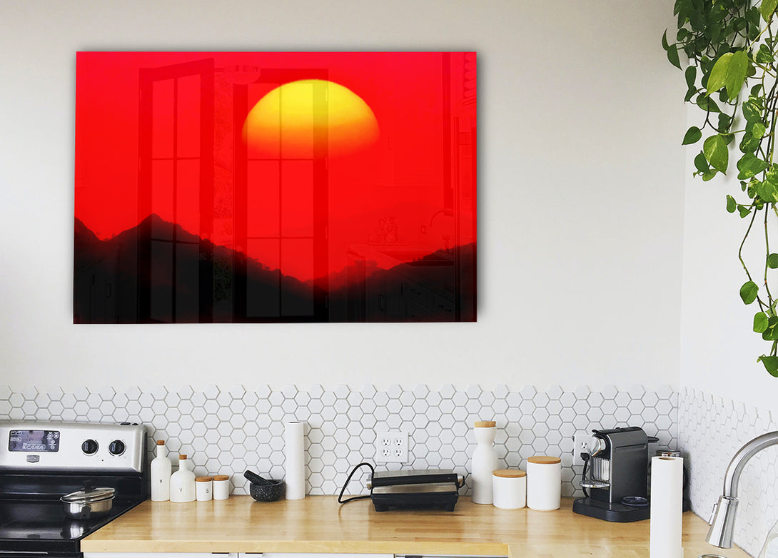 Huge Sun Over The Mountain Tops Red acrylic print, UV printed onto 5mm thick acrylic glass. Comes with everything you need to hang on your wall.