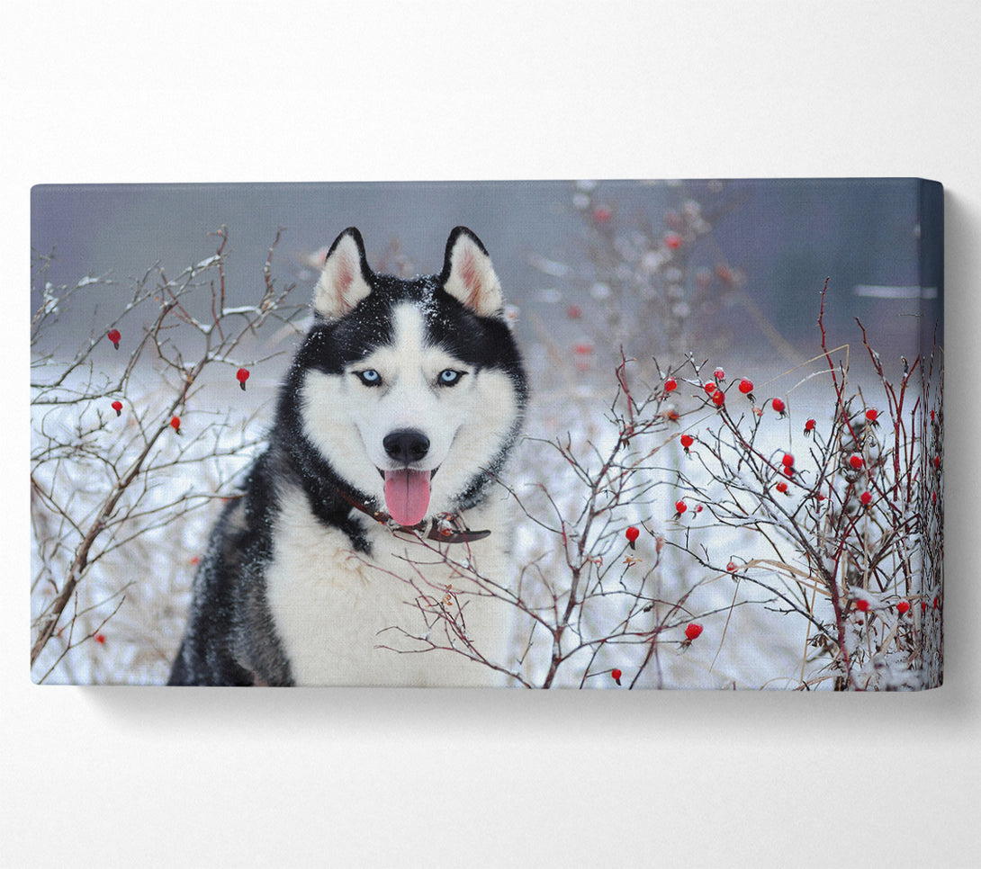 Husky Dog In The Winter wide canvas, printed on coated polyester canvas. Mounted on to a 44mm box frame, ready to hang.