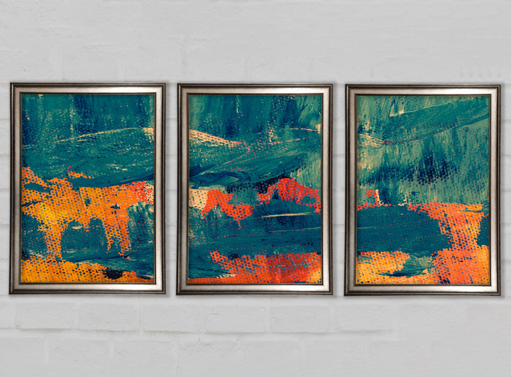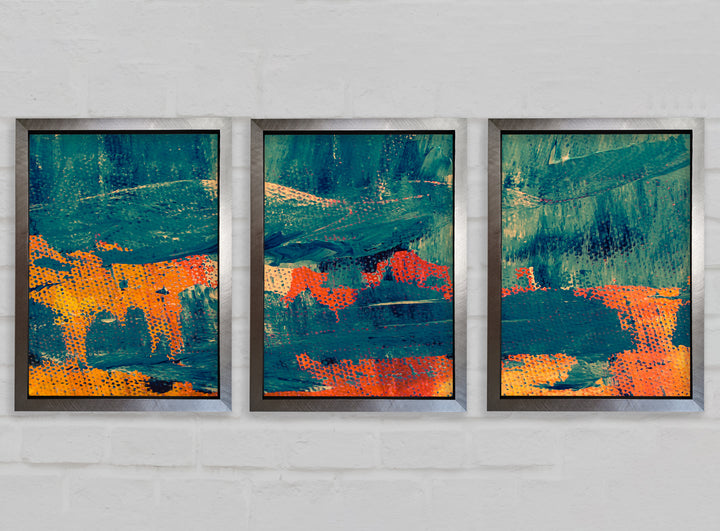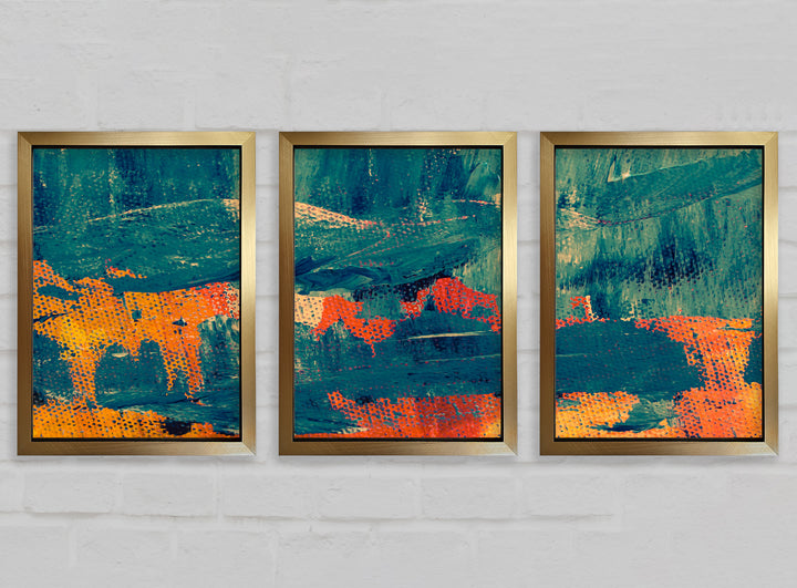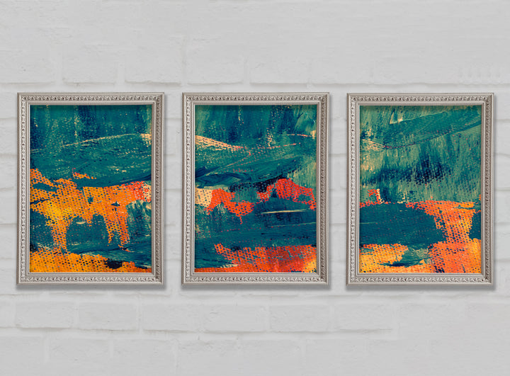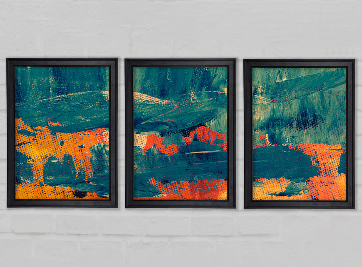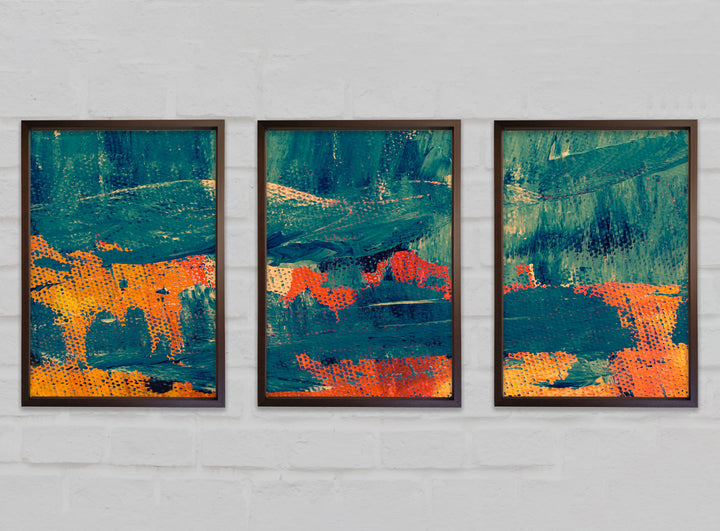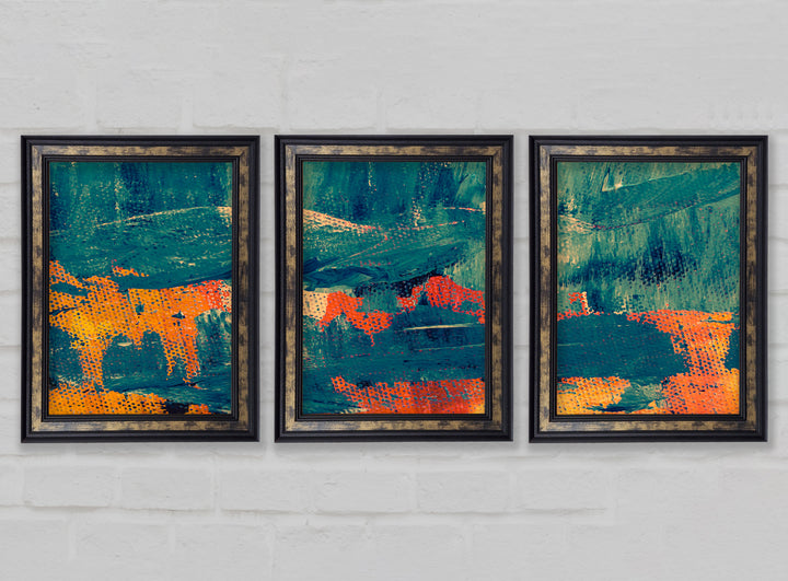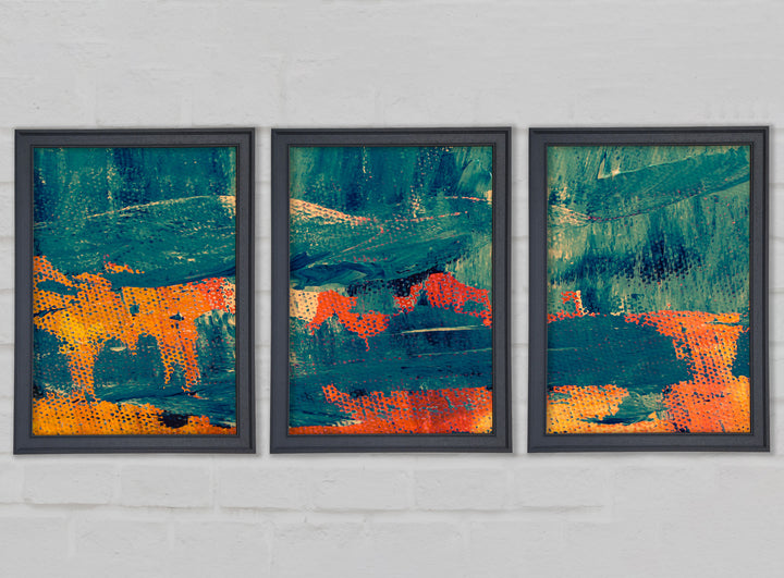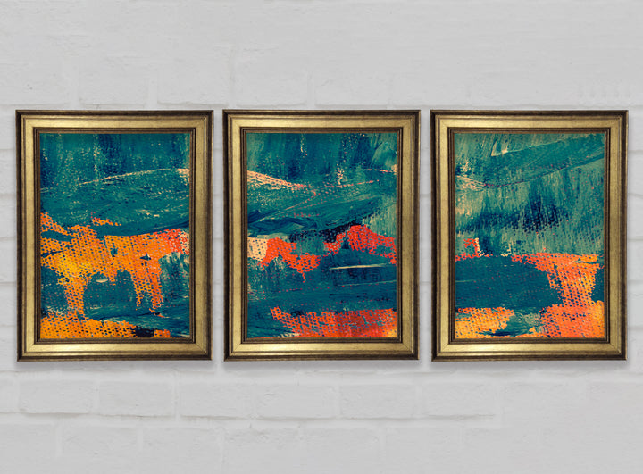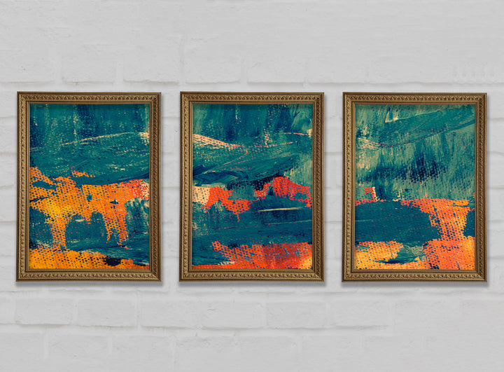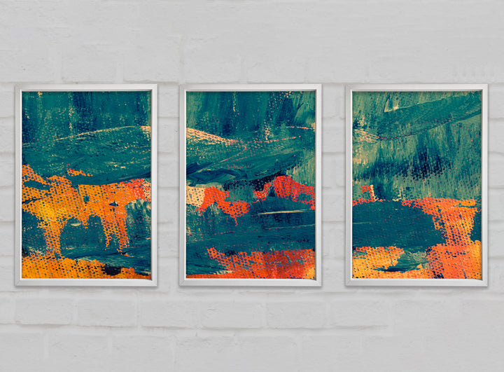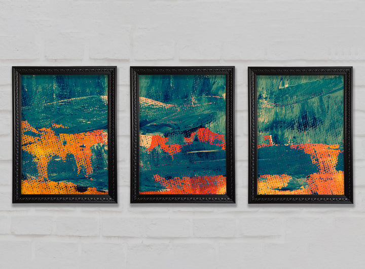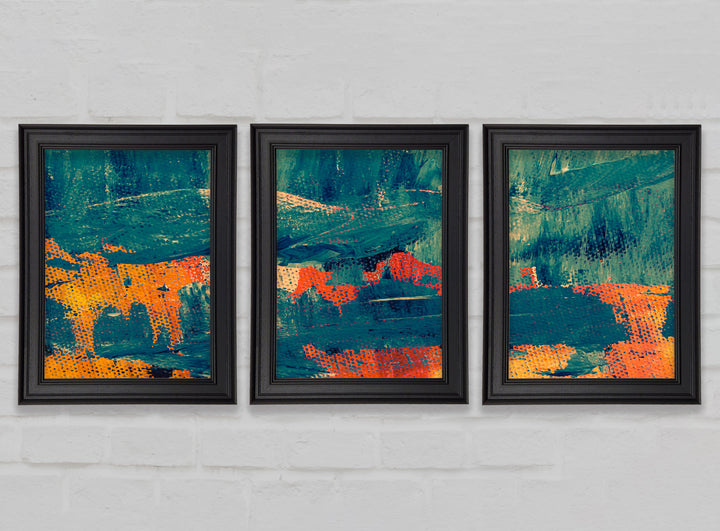 Ice and Fire Abstract set of 3 framed print wall art, available in mutiple frame colours. Ready to hang from the box and handmade in the United Kingdom.