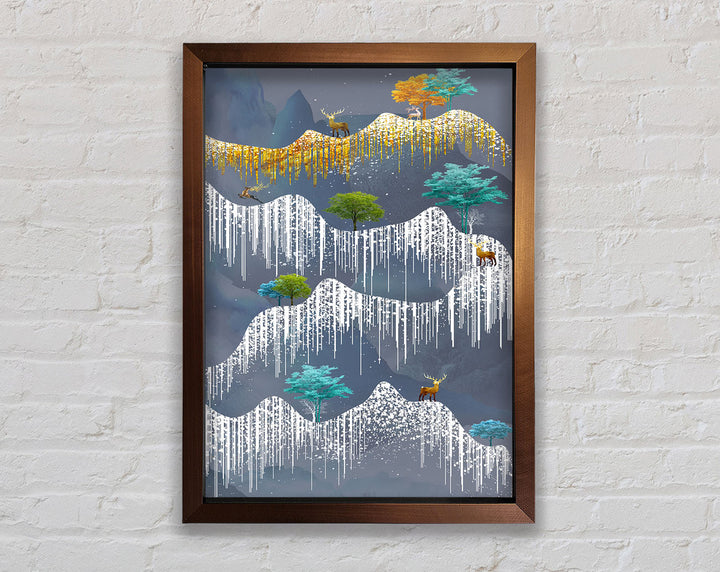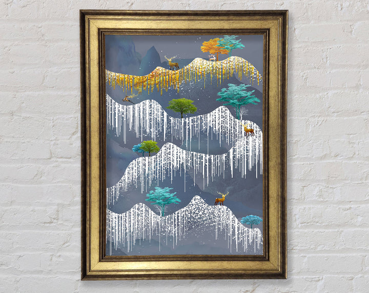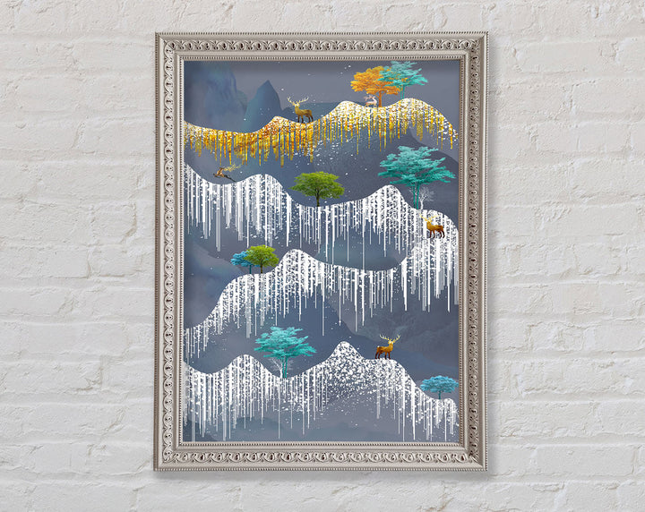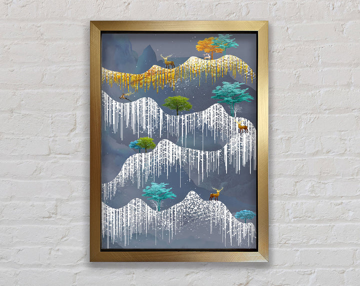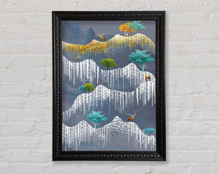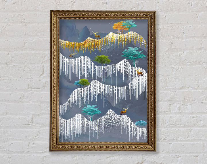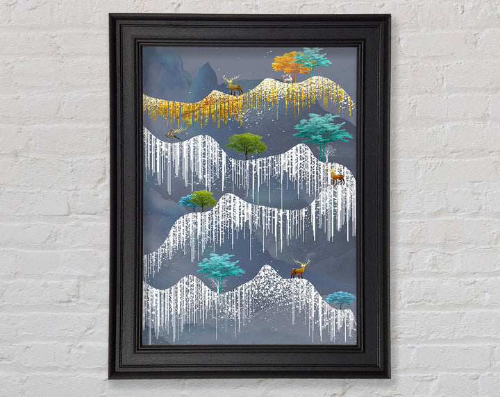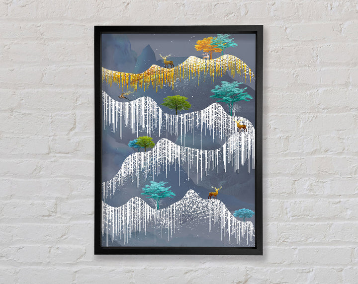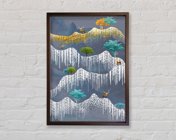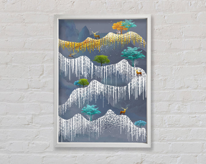Transform your living space with the captivating beauty of our Icy Abstract Mountains With Deer Framed Print. This stunning piece of framed art features a serene winter landscape, complete with majestic deer and icy mountains. Handmade in the United Kingdom, each print is crafted with care and attention to detail.