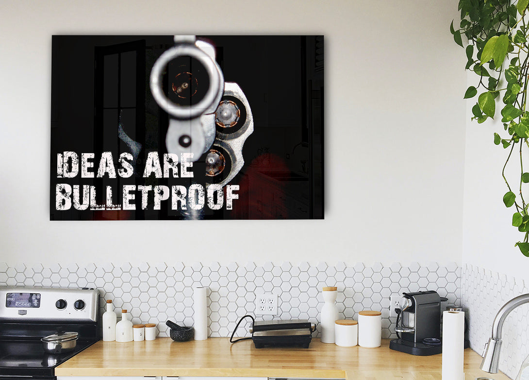 Ideas Are Bulletproof acrylic print, UV printed onto 5mm thick acrylic glass. Comes with everything you need to hang on your wall.