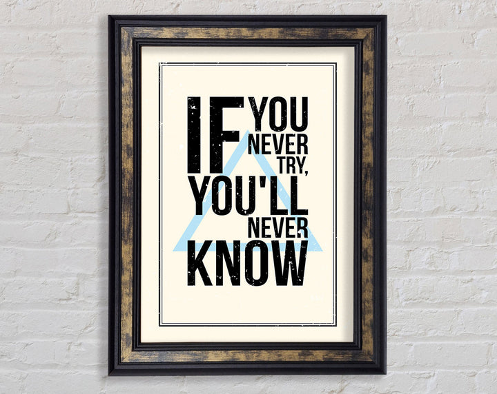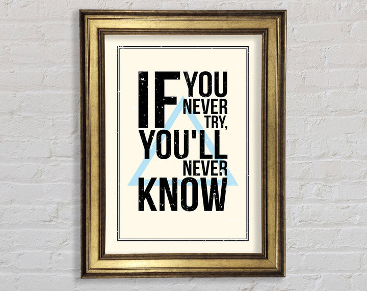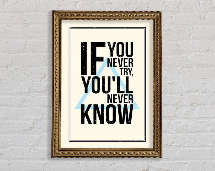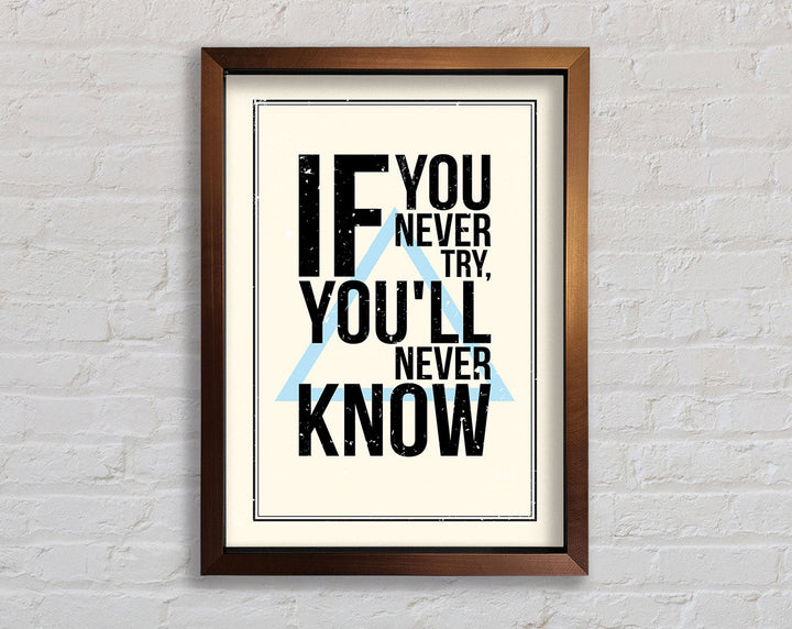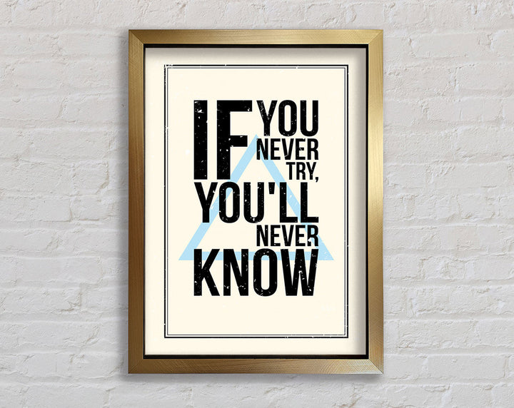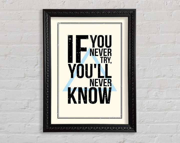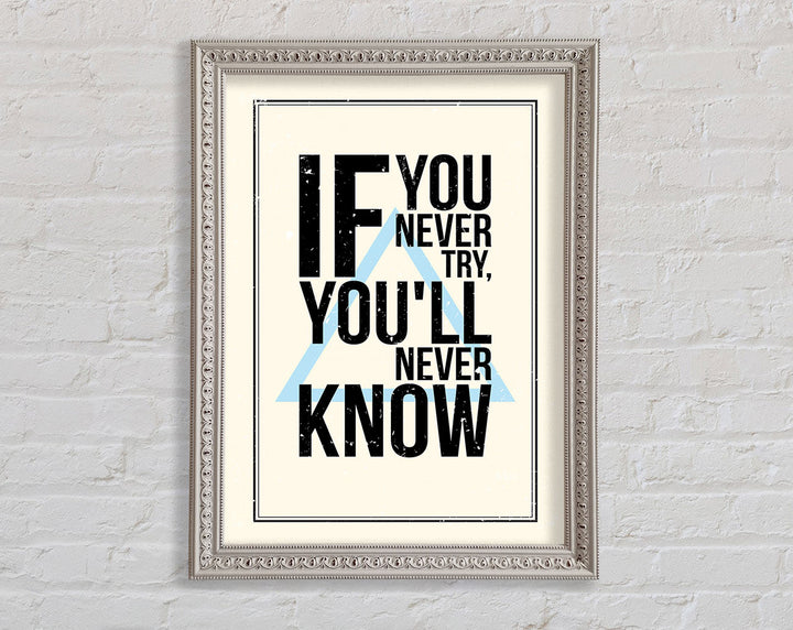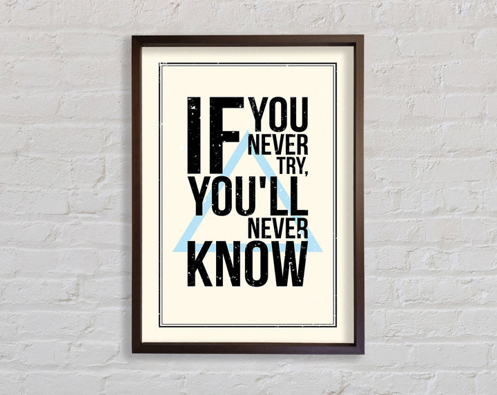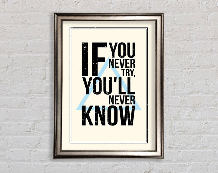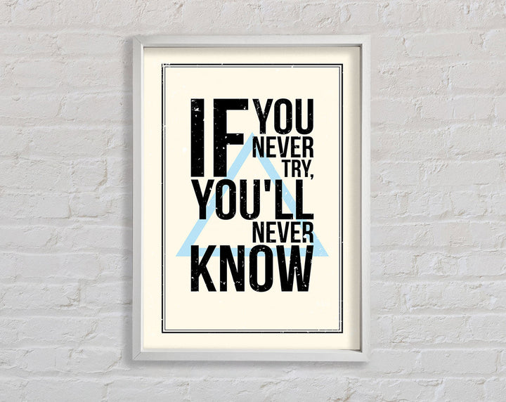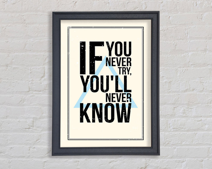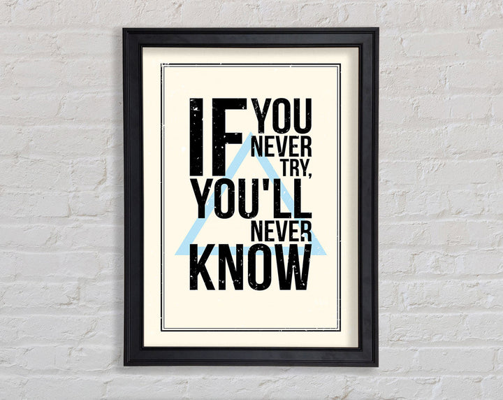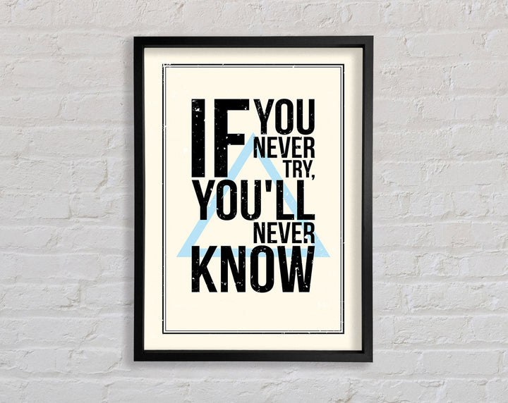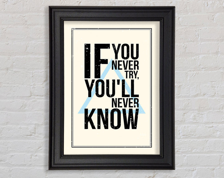 Introducing the "If You Never Try" framed print, an inspiring piece of framed art perfect for any space. This beautiful print is available in six different sizes, ranging from small to oversized, ensuring a perfect fit for any room in your home or office. Choose from a variety of colors to match your décor perfectly. Each piece is handmade in the United Kingdom with great attention to detail, ensuring high-quality craftsmanship. The print comes ready to hang, making it simple to immediately add a touch of motivation to your walls. Elevate your environment and inspire yourself daily with this charming and thoughtful framed art piece.