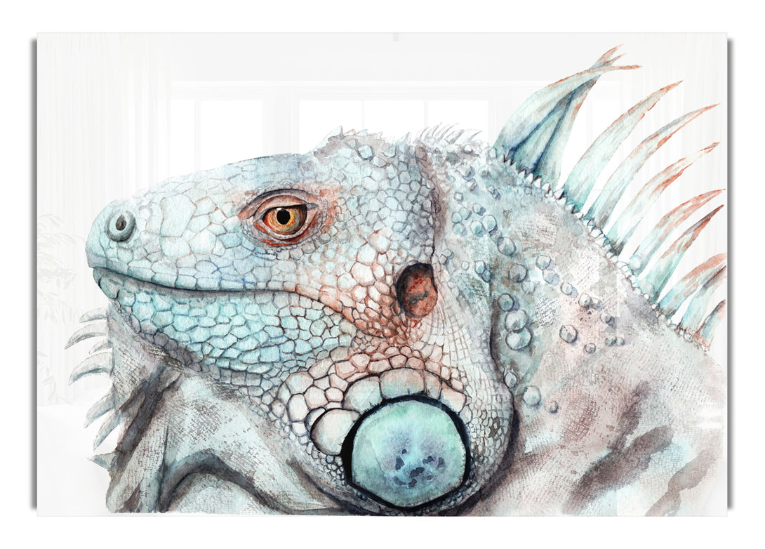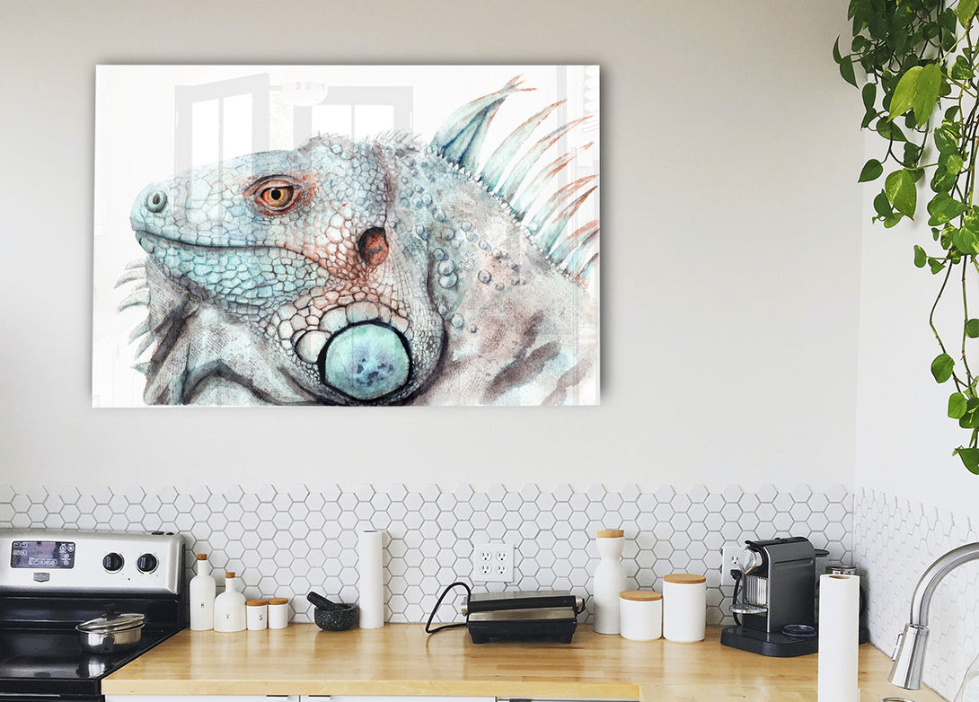 Iguana Stare acrylic print, UV printed onto 5mm thick acrylic glass. Comes with everything you need to hang on your wall.