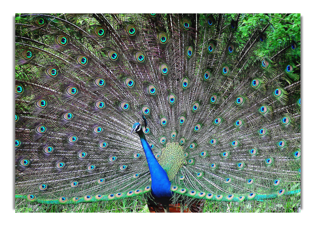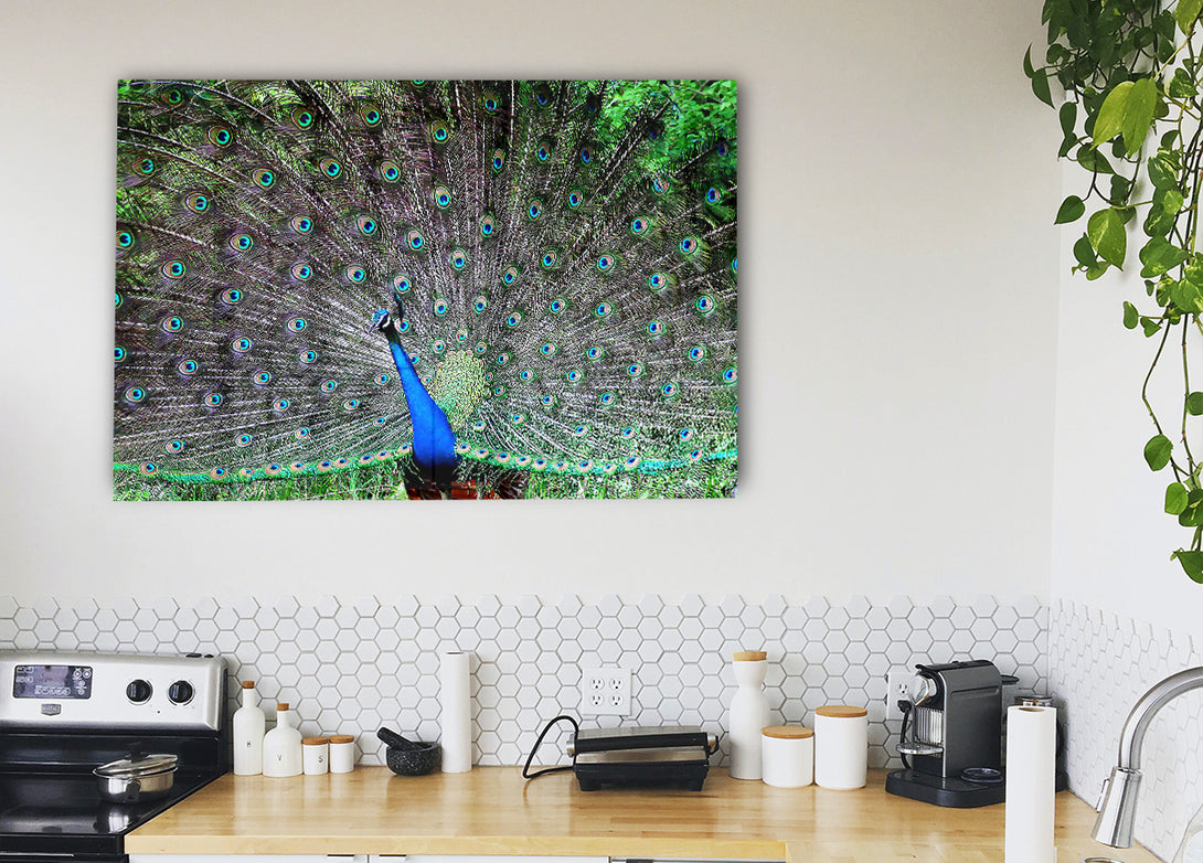 Indian Peafowl acrylic print, UV printed onto 5mm thick acrylic glass. Comes with everything you need to hang on your wall.