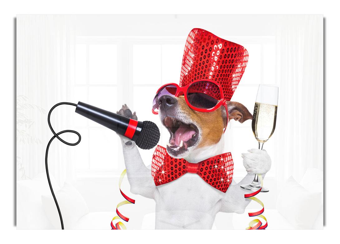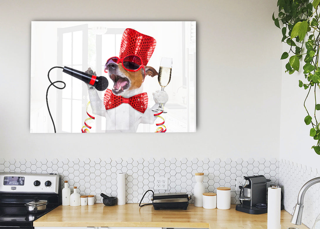 Jack russell kareoke acrylic print, UV printed onto 5mm thick acrylic glass. Comes with everything you need to hang on your wall.