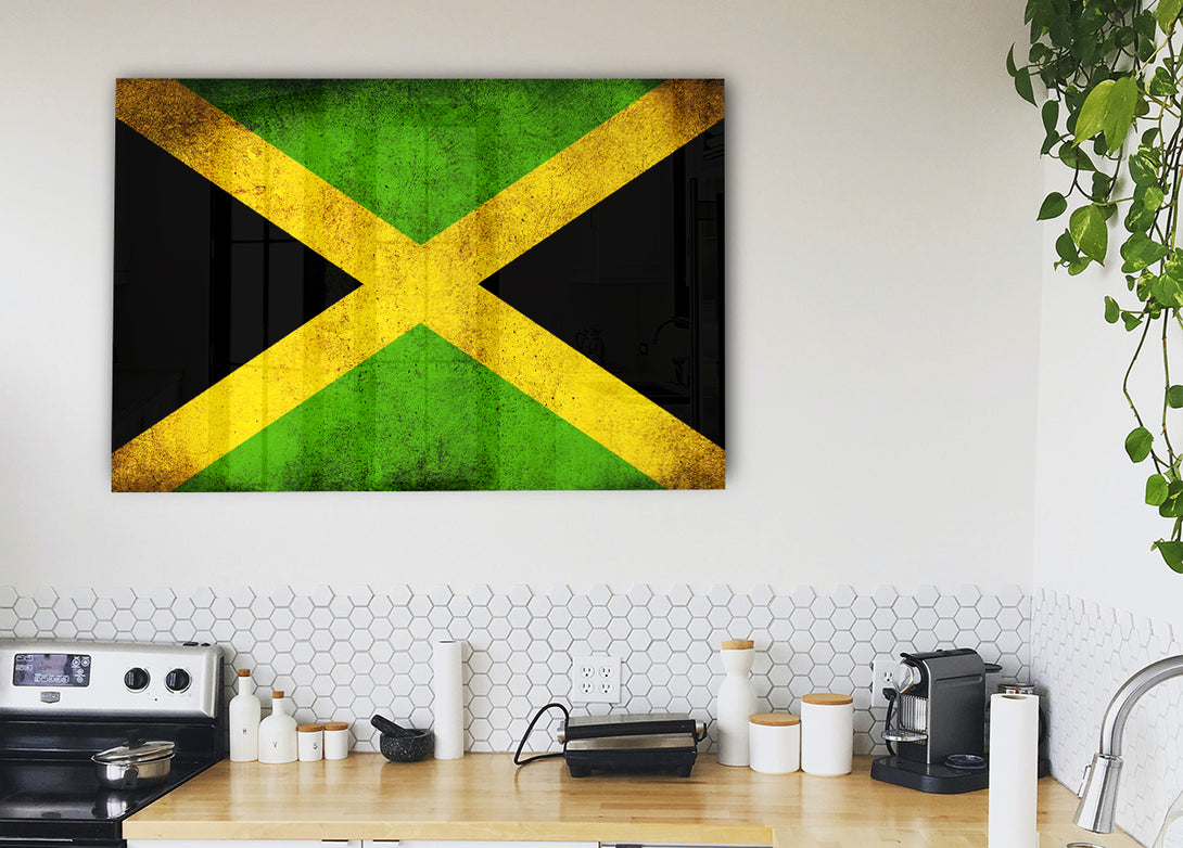 Jamaican Grunge Flag acrylic print, UV printed onto 5mm thick acrylic glass. Comes with everything you need to hang on your wall.