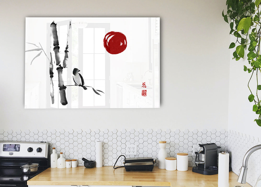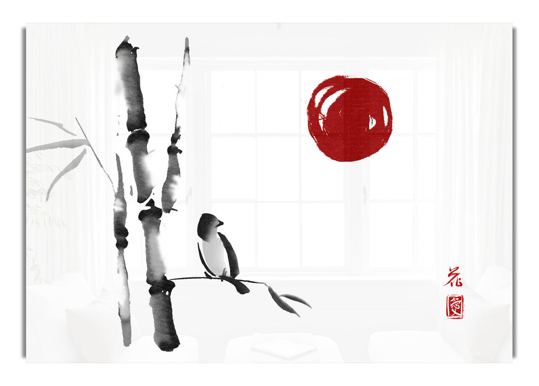 Japanese Bamboo Bird In The Red Sun acrylic print, UV printed onto 5mm thick acrylic glass. Comes with everything you need to hang on your wall.