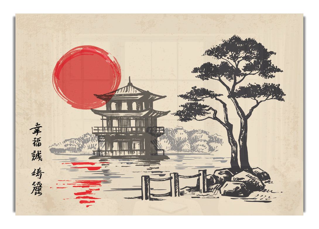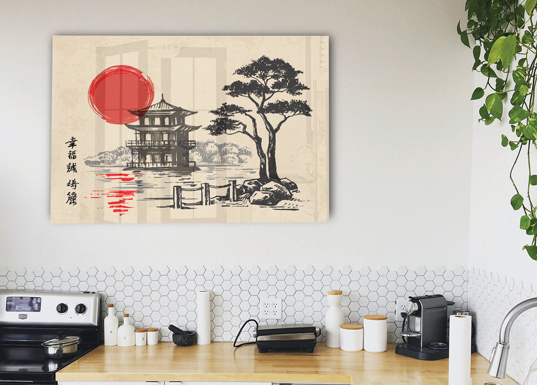 Japanese Red Sun Buildings acrylic print, UV printed onto 5mm thick acrylic glass. Comes with everything you need to hang on your wall.