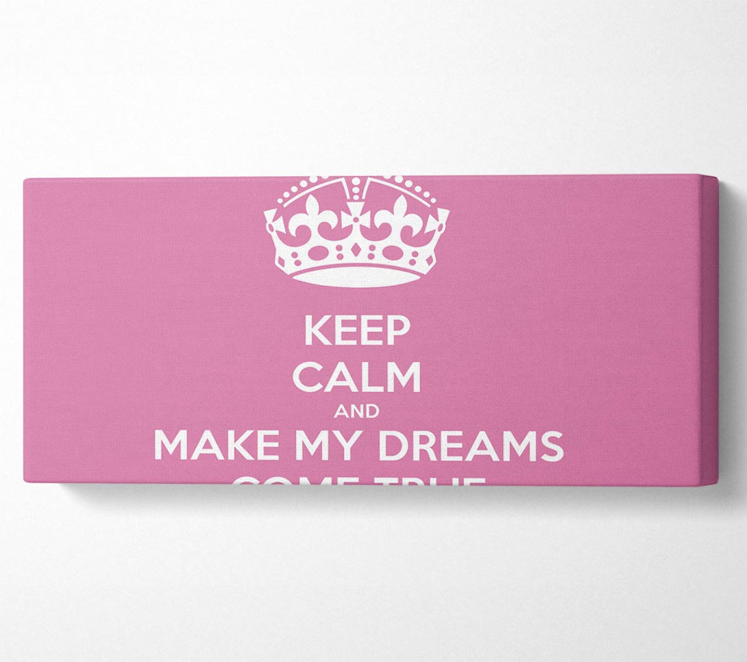 Keep Calm Make Your Dreams Come True Pink canvas, printed on coated polyester canvas. Mounted on to a 44mm box frame, ready to hang.