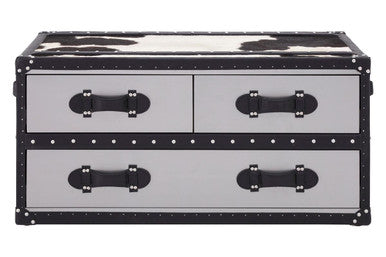 Its three drawers boast sleek aluminium facing, with genuine leather strap handles contributing to the monochrome look. Reflective metal studs glint against the genuine leather trim that borders the table. Decorative handles at the side accentuate the travelling trunk look. This product is made from genuine cowhide. Individual units are likely to have slightly different colours, textures, or markings from the image as this is a natural material.