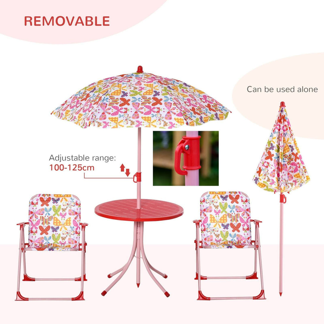 The Outsunny 4-piece kids outdoor patio set with umbrella is specially designed for kids, gives them their very own outdoor seating area to eat meals, play games, and more. A matching umbrella is included to provide shade during the summer and on otherwise sunny days. With its beautiful and colorful pattern design, it makes a great addition to any backyard setting. Thanks to Outsunny, your kids will love having furniture that' made especially with them in mind!
