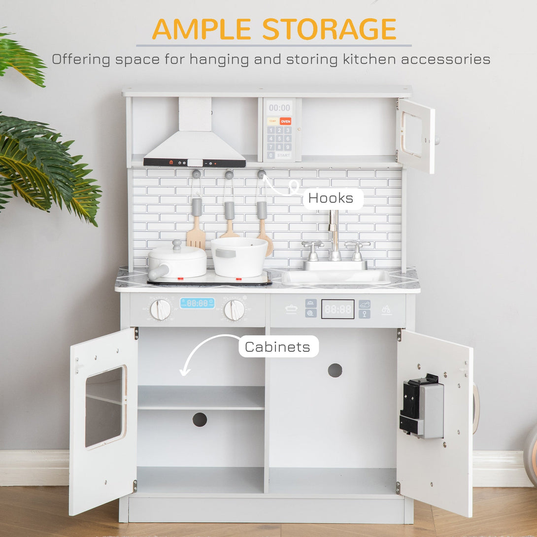 This wooden kid's kitchen set from HOMCOM is perfect for kids who like to pretend! A complete set of accessories is included detachable sink, simulation faucet, microwave, range hood, 5 pcs wooden kitchen accessories and more. Toddlers will have a blast pretending to cook on the pretend stove burner that features sounds and light. Sharing the play kid's accessories and appliances gets kids interacting with each other, building social skills as they cook and play the day away!