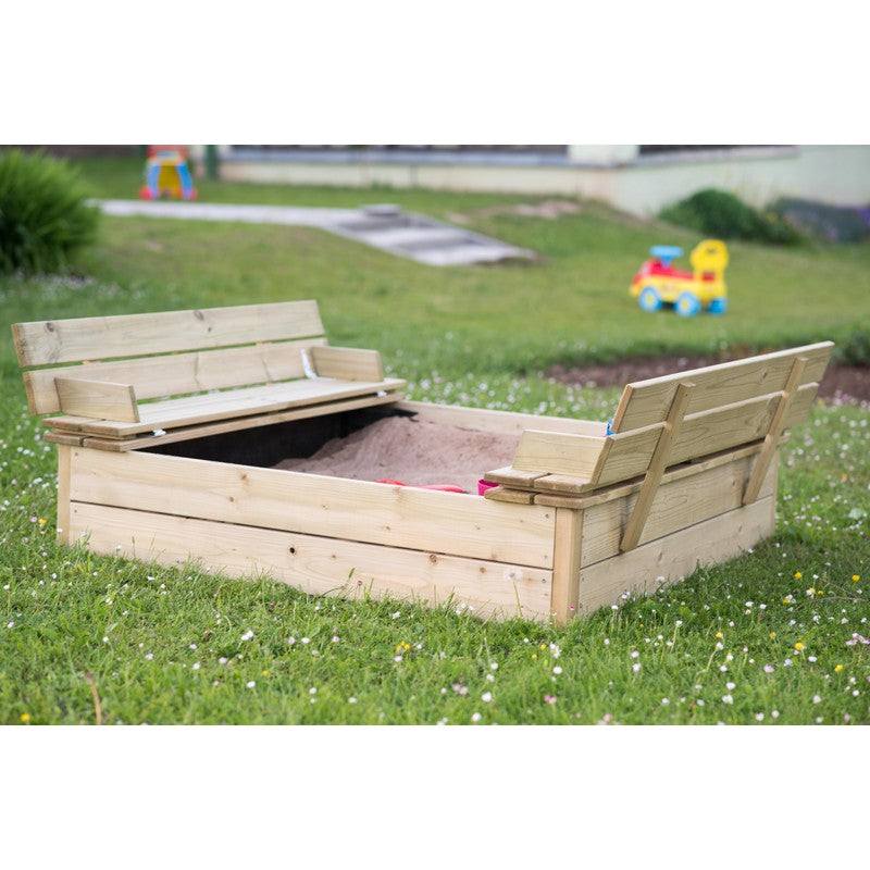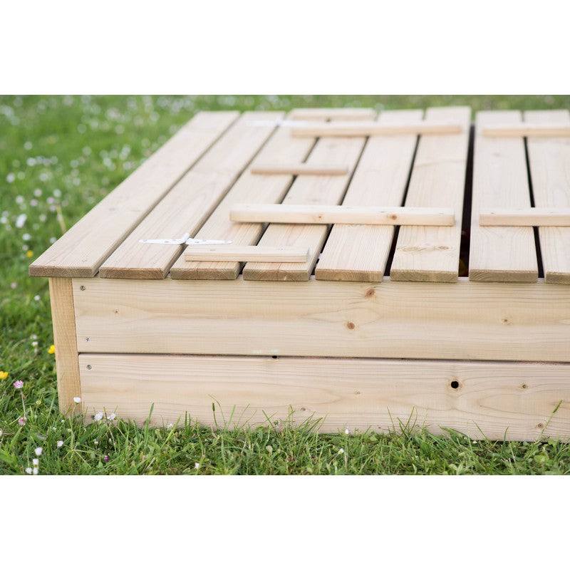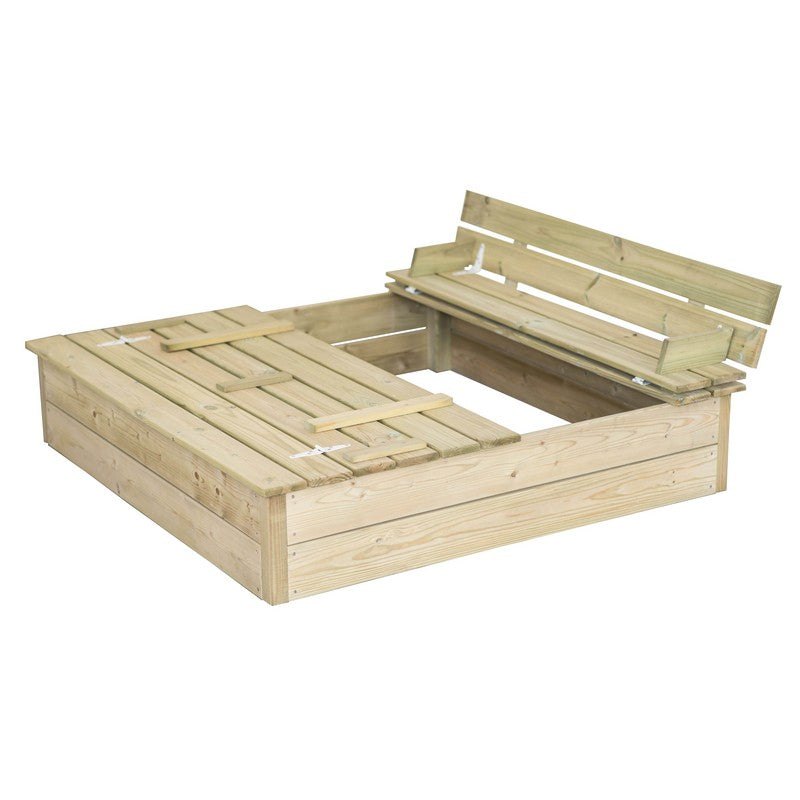 Square sandbox with lid and seats.Wooden sandbox is ideal for children to play in the garden and enjoy the outdoors.The lid can be easily transformed into a seat on one or both sides, for children's play in the sand.