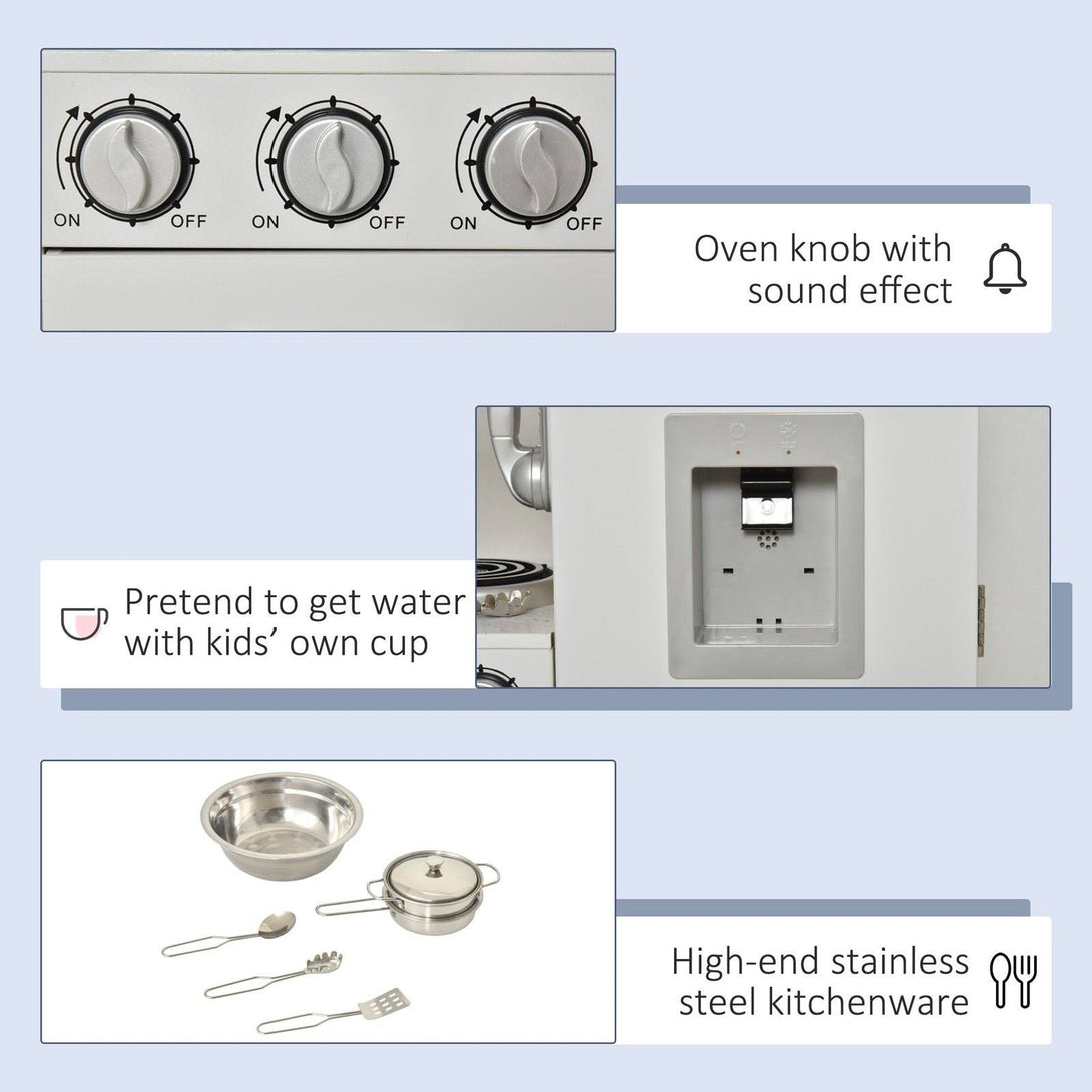 Let fun and creativity emerge with the help of this HOMCOM kitchen play set. Pretend kitchenware is included to give them plenty to play with, with storage in the drawer, cabinets and oven giving them room to keep everything together. It features an interactive sink, induction cooker, telephone and water dispenser, making everything seem more realistic and fun. The main structure is made from MDF, with stainless steel parts and pine wood legs, meaning the whole of this set is durable and reliable for continual play time use by your child and their friends. For ages 3+ years.