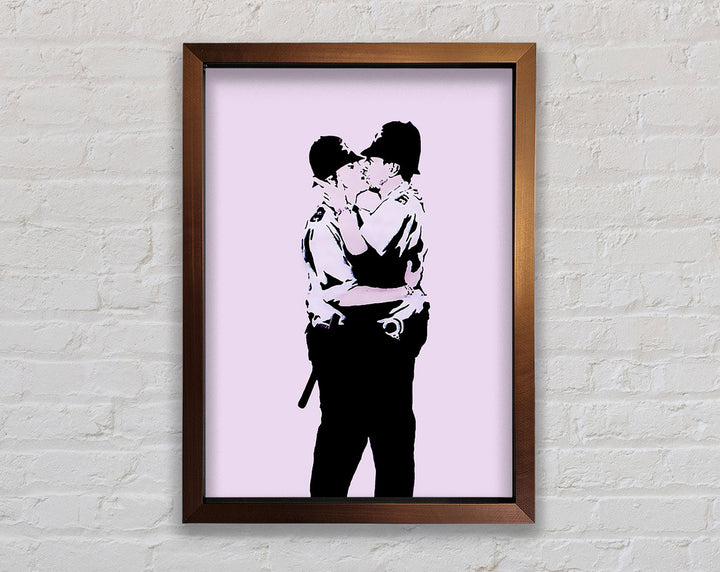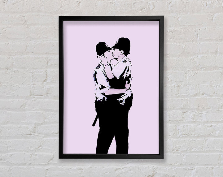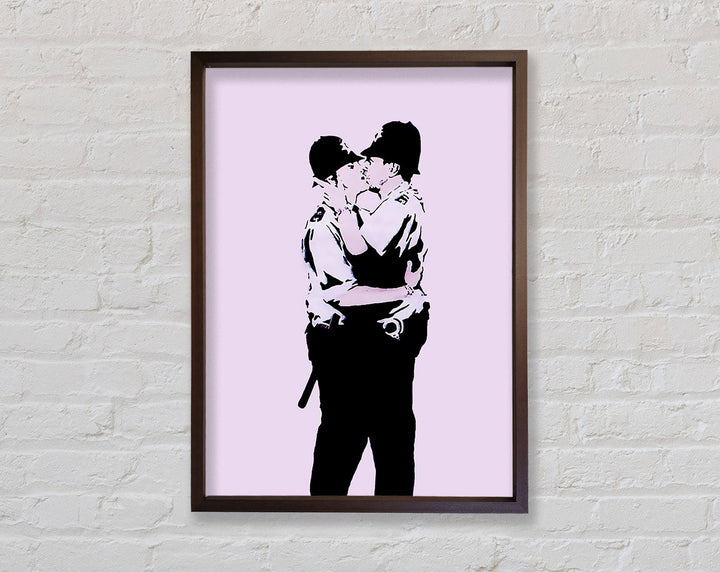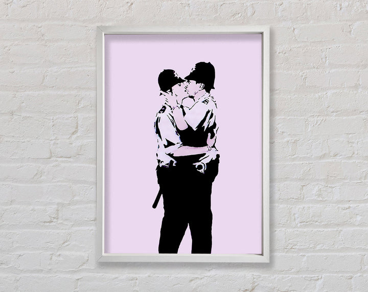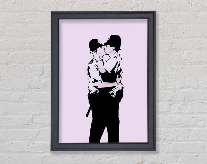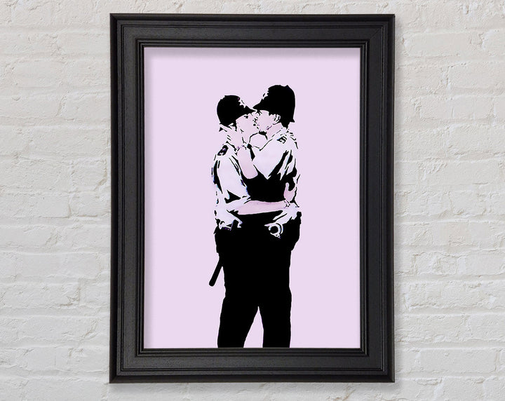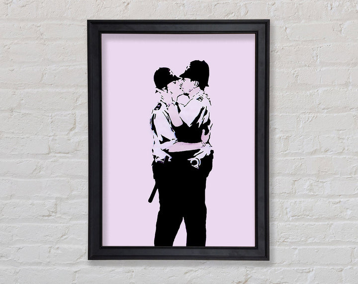 Introducing the Kissing Coppers Pink Framed Print, a stunning piece of framed art that brings a touch of modern elegance to any space. This unique print captures the iconic image of two police officers sharing a kiss, set against a vibrant pink background. Available in six different sizes, from small to oversized, this artwork can perfectly fit any wall, big or small.